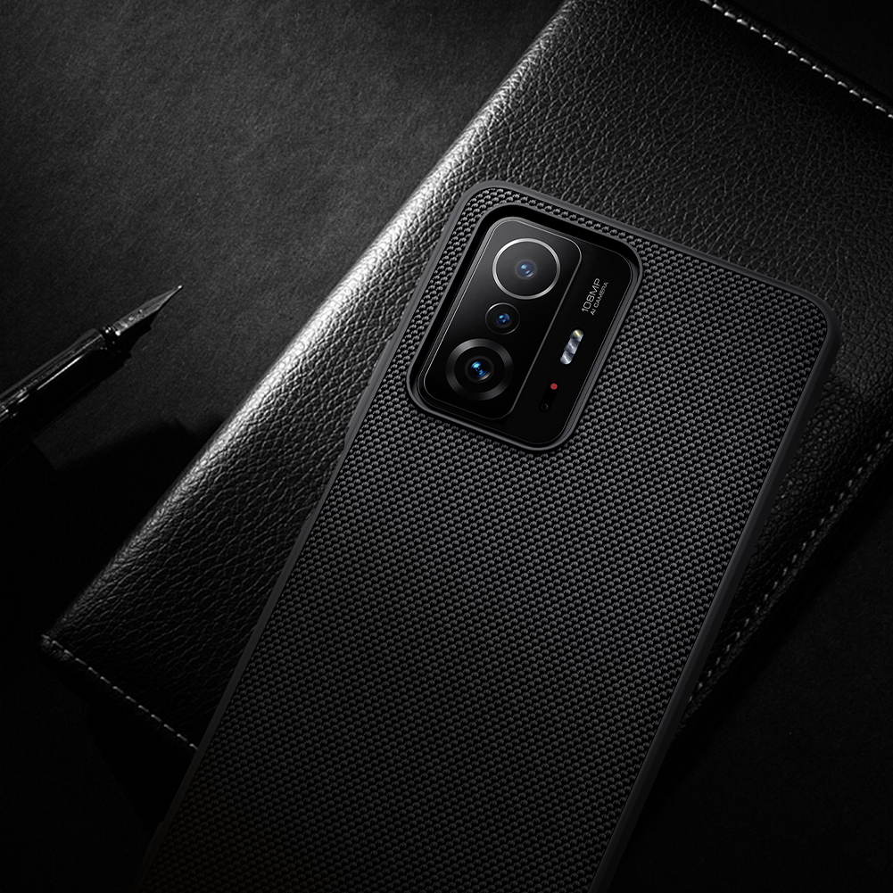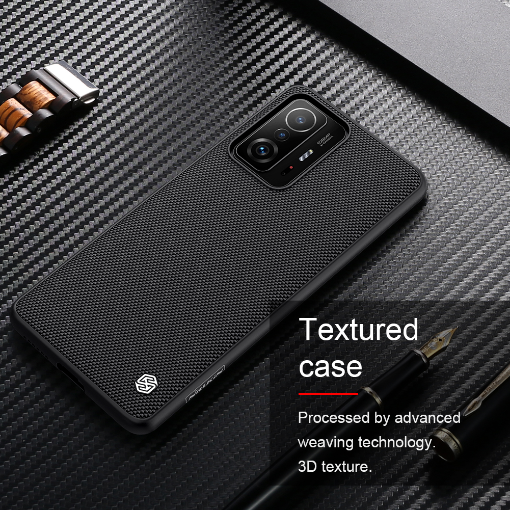 Тонкий чехол черного цвета из нейлонового волокна от Nillkin серии Textured Case для смартфона Xiaomi 11T и 11T Pro изготавливается из прочного и долговечного материала из очищенного нейлонового волокна.