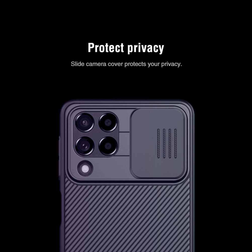 Противоударный чехол черного цвета с защитной крышкой задней камеры серии CamShield Case от Nillkin для телефона Samsung Galaxy M53 5G, создан для любителей активного отдыха.