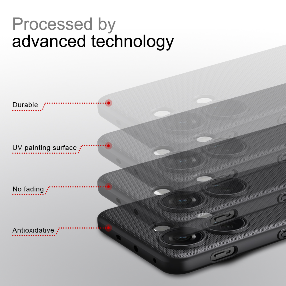 Тонкий чехол черного цвета от Nillkin серии Super Frosted Shield для смартфона OnePlus Ace 2V и Nord 3 5G изготавливается из экологичных материалов путем высокоточного литья под давление с высокой температурой.