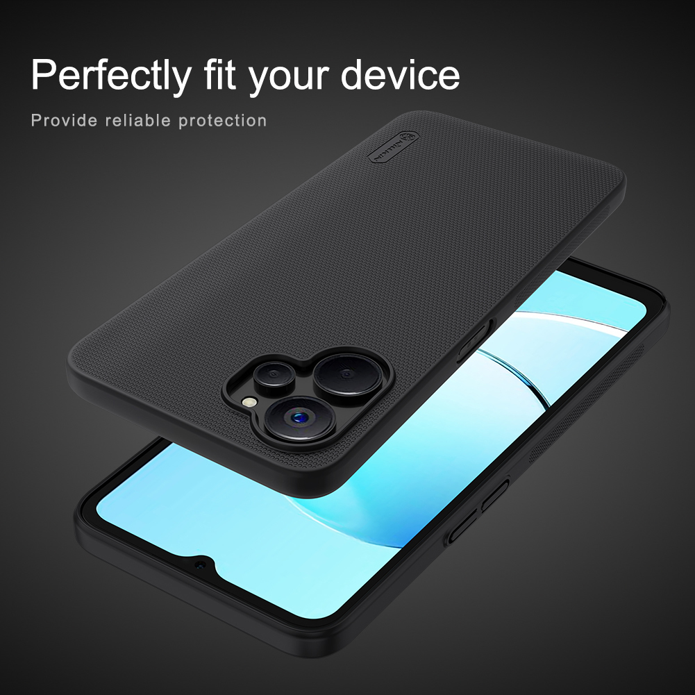 Тонкий чехол черного цвета от Nillkin серии Super Frosted Shield для смартфона Realme 9i 5G, 10 5G и 10T 5G изготавливается из экологичных материалов путем высокоточного литья под давление с высокой температурой.