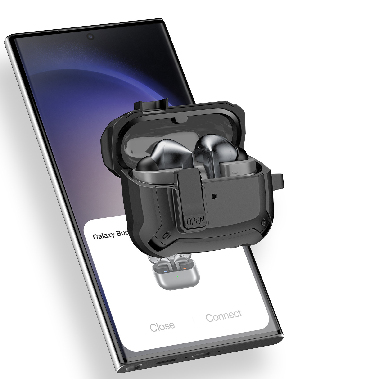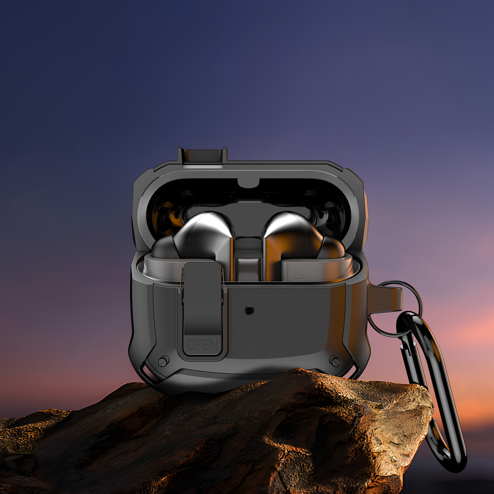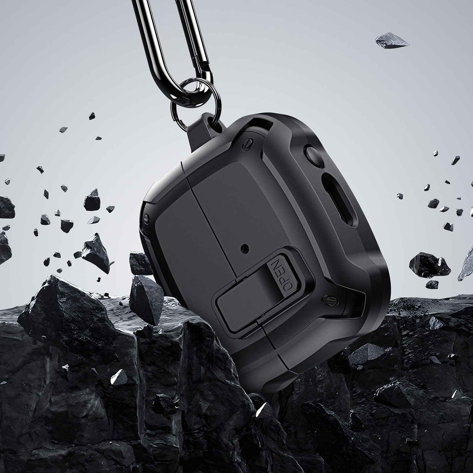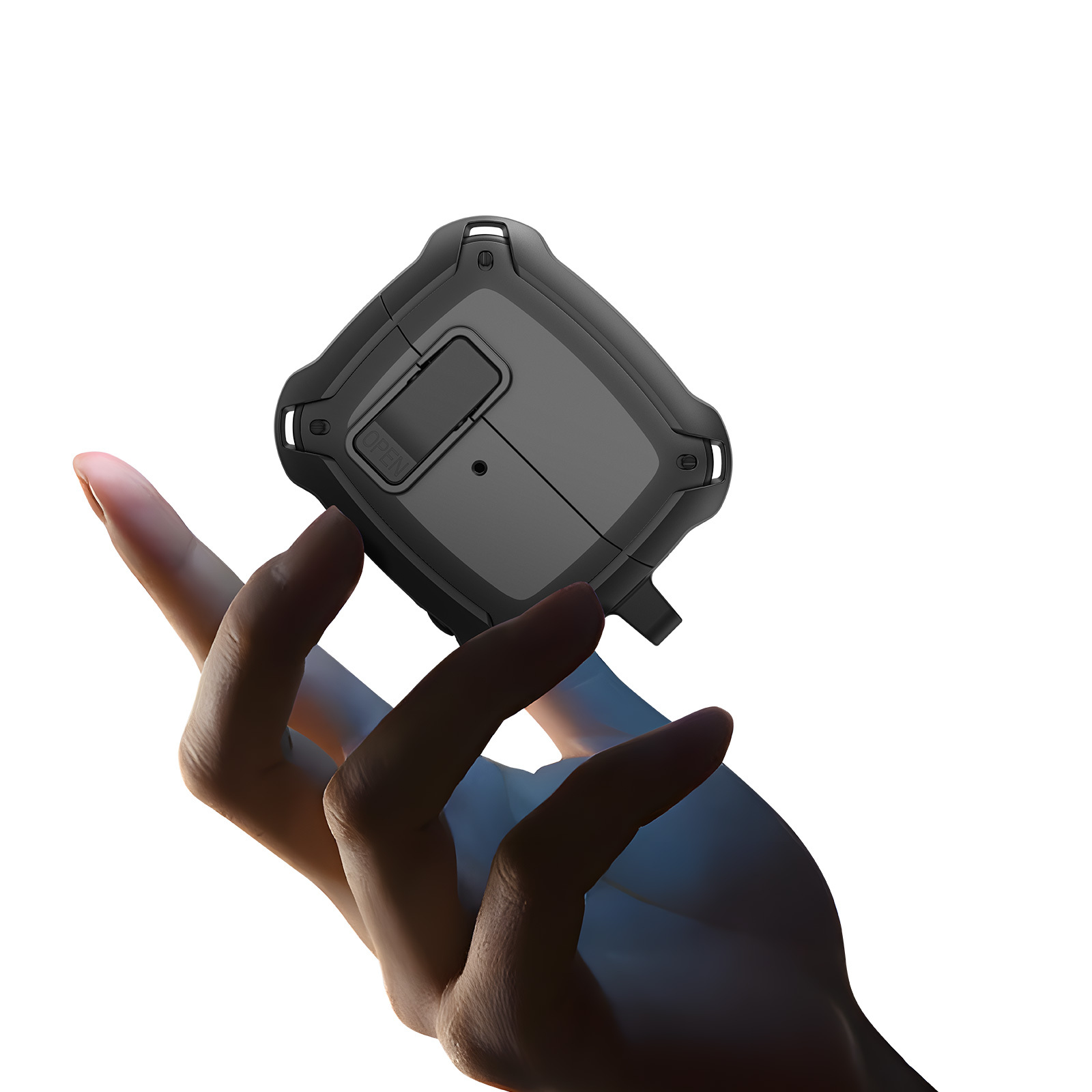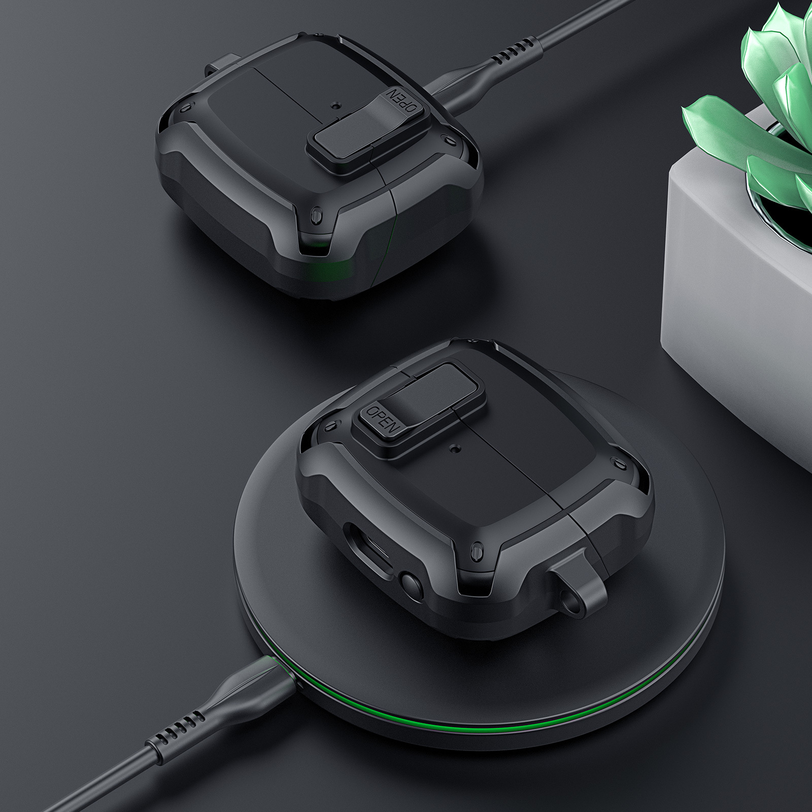 Чехол черного цвета для Samsung Buds 3 и Buds 3 Pro от Dux Ducis серии SECH Series Case выполнен из высококачественного плотного TPU + PC, обеспечивает плотное прилегание и надёжную защиту. Защитный чехол поддерживает проводную и беспроводную зарядку без снятия чехла Samsung Buds 3 и Buds 3 Pro. Виден передний светодиод зарядного кейса.