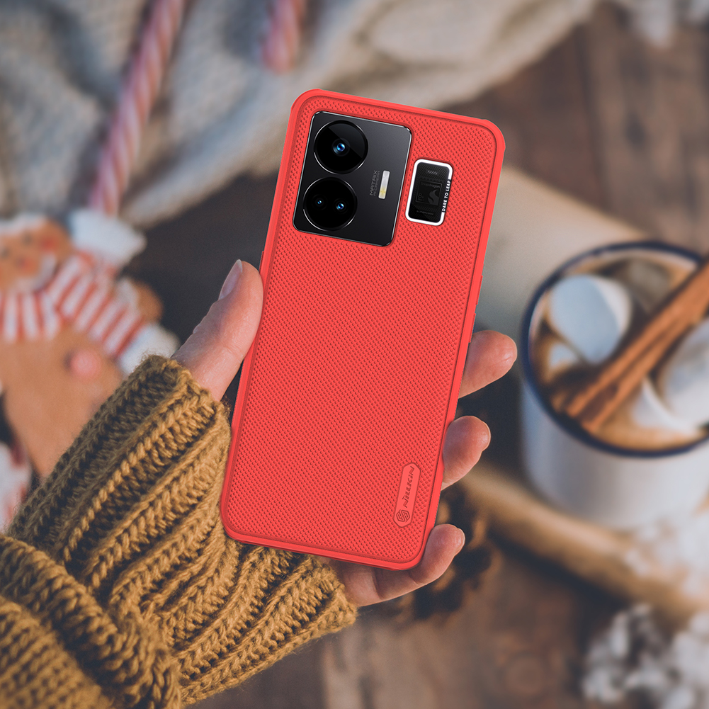 Усиленный двухкомпонентный чехол красного цвета от Nillkin серии Super Frosted Shield для смартфона Realme GT Neo 5 с усиленными боковыми рамками по четырем углам, изготавливается из экологичных материалов PC и TPU путем высокоточного литья под давление с высокой температурой.