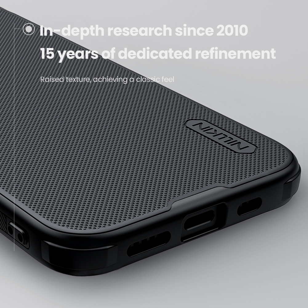 Защитный чехол черного цвета от Nillkin серии Super Frosted Shield Pro для смартфона iPhone 16e с усиленными боковыми рамками по четырем углам, изготавливается из экологичных материалов PC и TPU путем высокоточного литья под давление с высокой температурой.