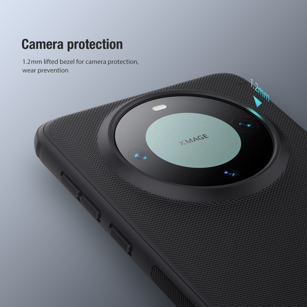 Защитный чехол черного цвета от Nillkin серии Super Frosted Shield Pro для смартфона Huawei Mate 60 Pro с усиленными боковыми рамками по четырем углам, изготавливается из экологичных материалов PC и TPU путем высокоточного литья под давление с высокой температурой.