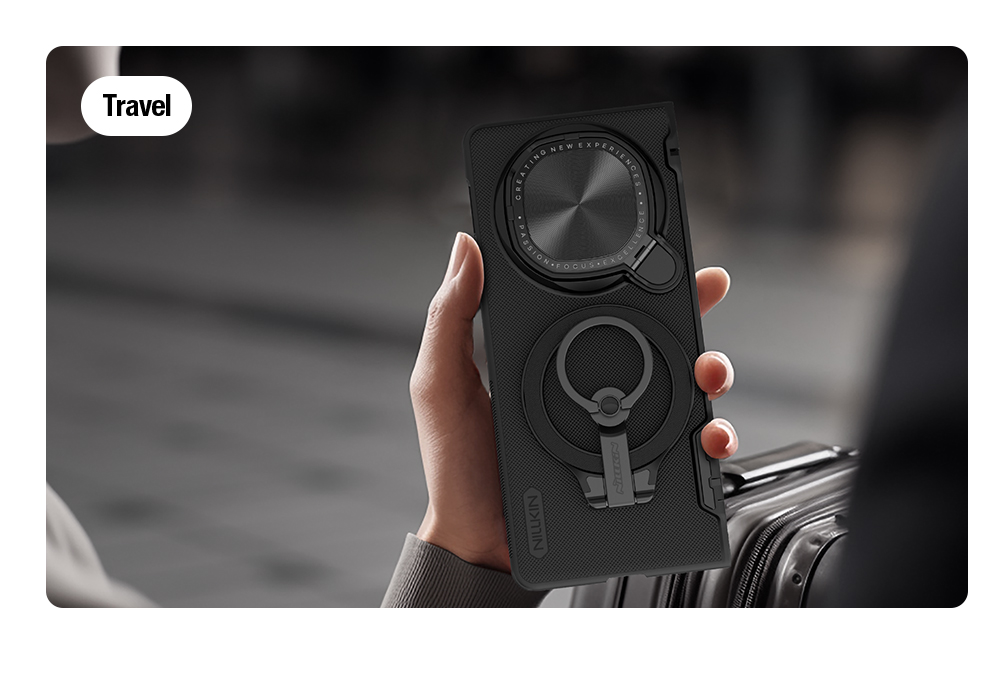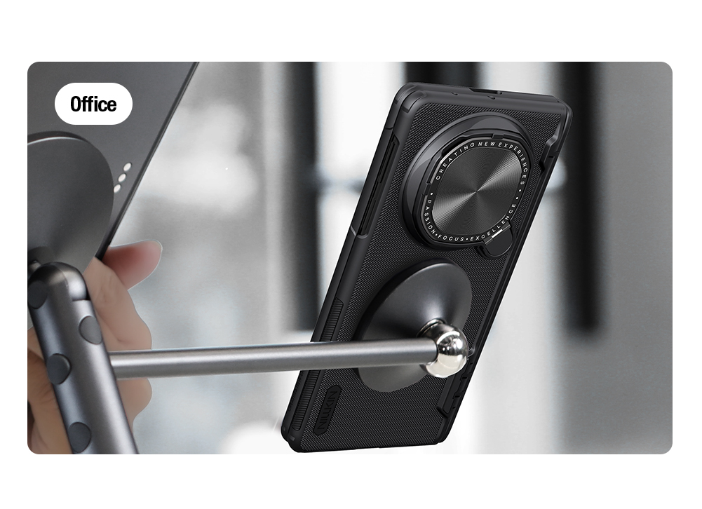 Противоударный чехол черного цвета с откидной металлической защитной крышкой для камеры и поддержкой MagSafe от Nillkin серии Super Frosted Shield Prop Magnetic Case для телефона Huawei Mate X6 создан для любителей активного отдыха.
