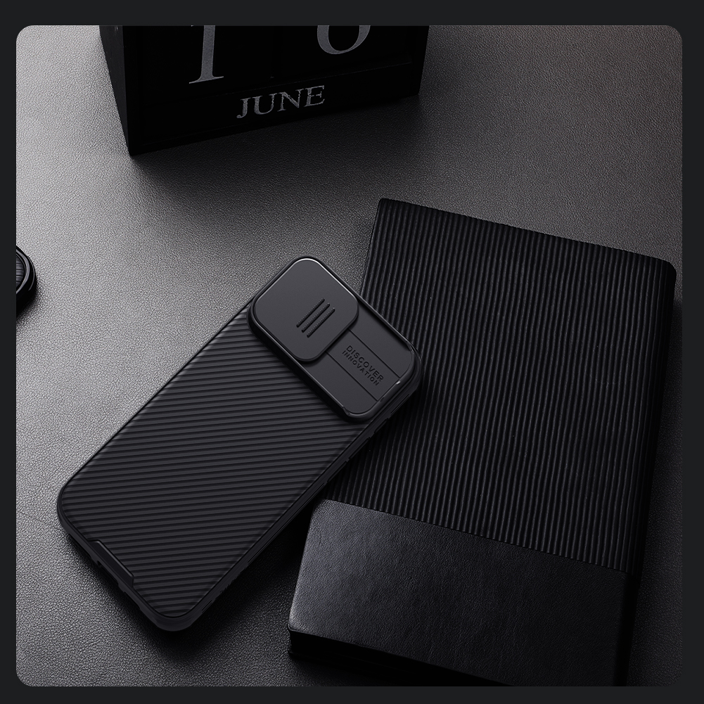 Противоударный чехол черного цвета с защитной шторкой задней камеры от Nillkin серии CamShield Pro Case для телефона iPhone 16 Pro Max создан для любителей активного отдыха.