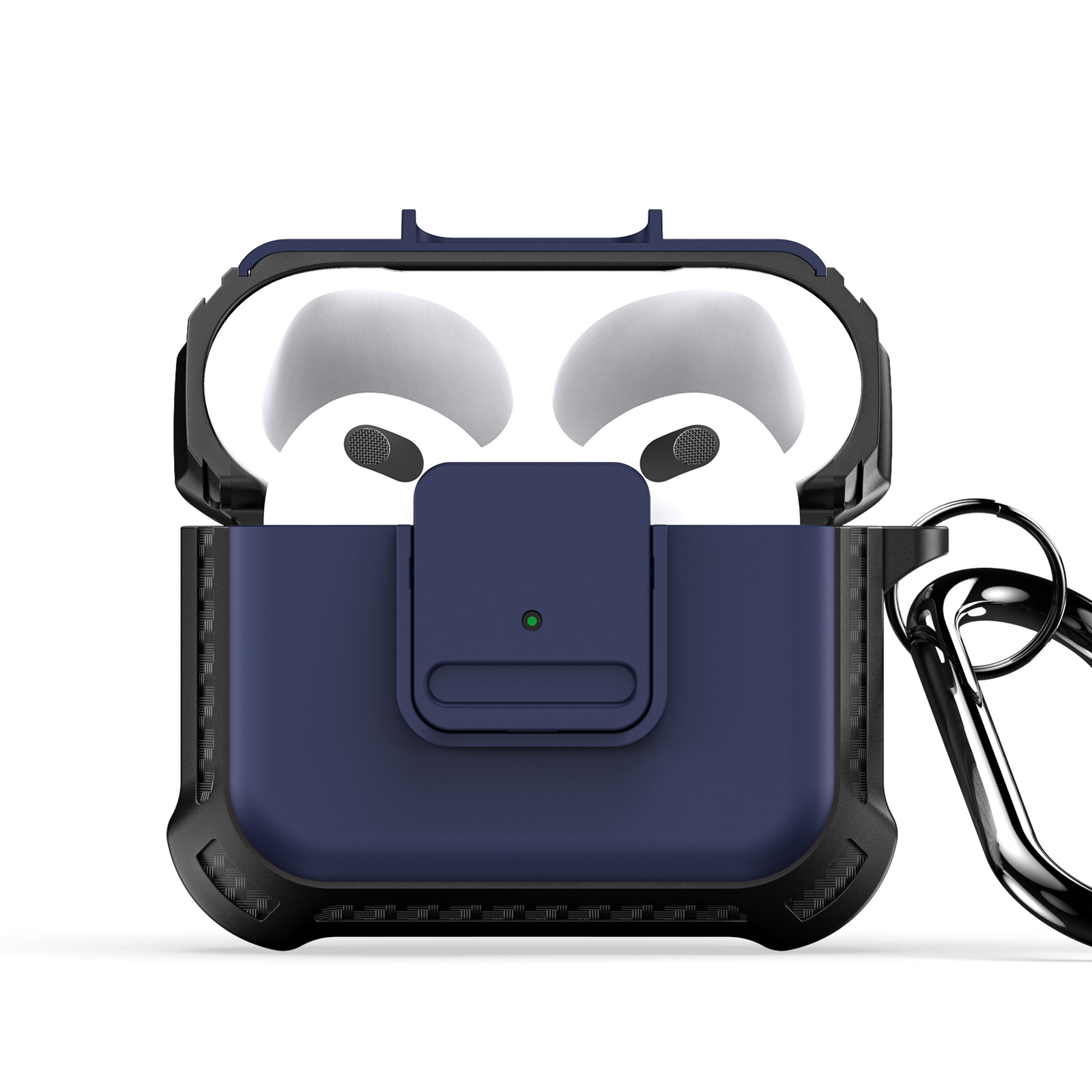 Усиленный чехол с вставками темно-синего цвета от Dux Ducis для наушников AirPods 3, серия PECG Series Case, в комплекте с карабином выполнен из высококачественного плотного TPU + PC, обеспечивает плотное прилегание и надёжную защиту. Защитный чехол поддерживает проводную и беспроводную зарядку без снятия чехла AirPods 3. Виден передний светодиод зарядного кейса.