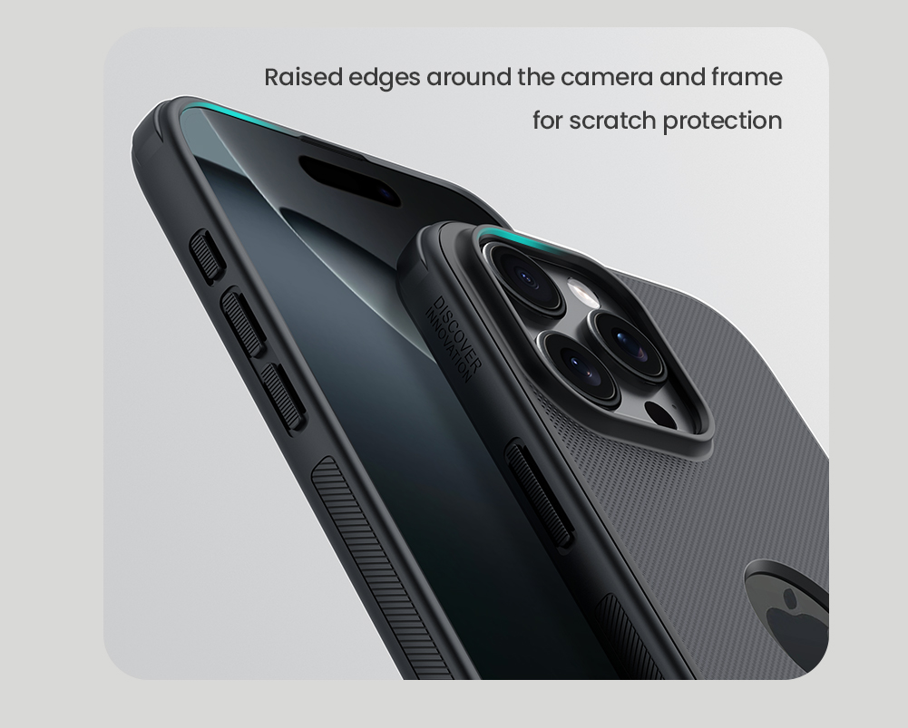 Защитный чехол черного цвета от Nillkin серии Super Frosted Shield (версия с вырезом под лого) для смартфона iPhone 16 Pro с усиленными боковыми рамками по четырем углам, изготавливается из экологичных материалов PC и TPU путем высокоточного литья под давление с высокой температурой.