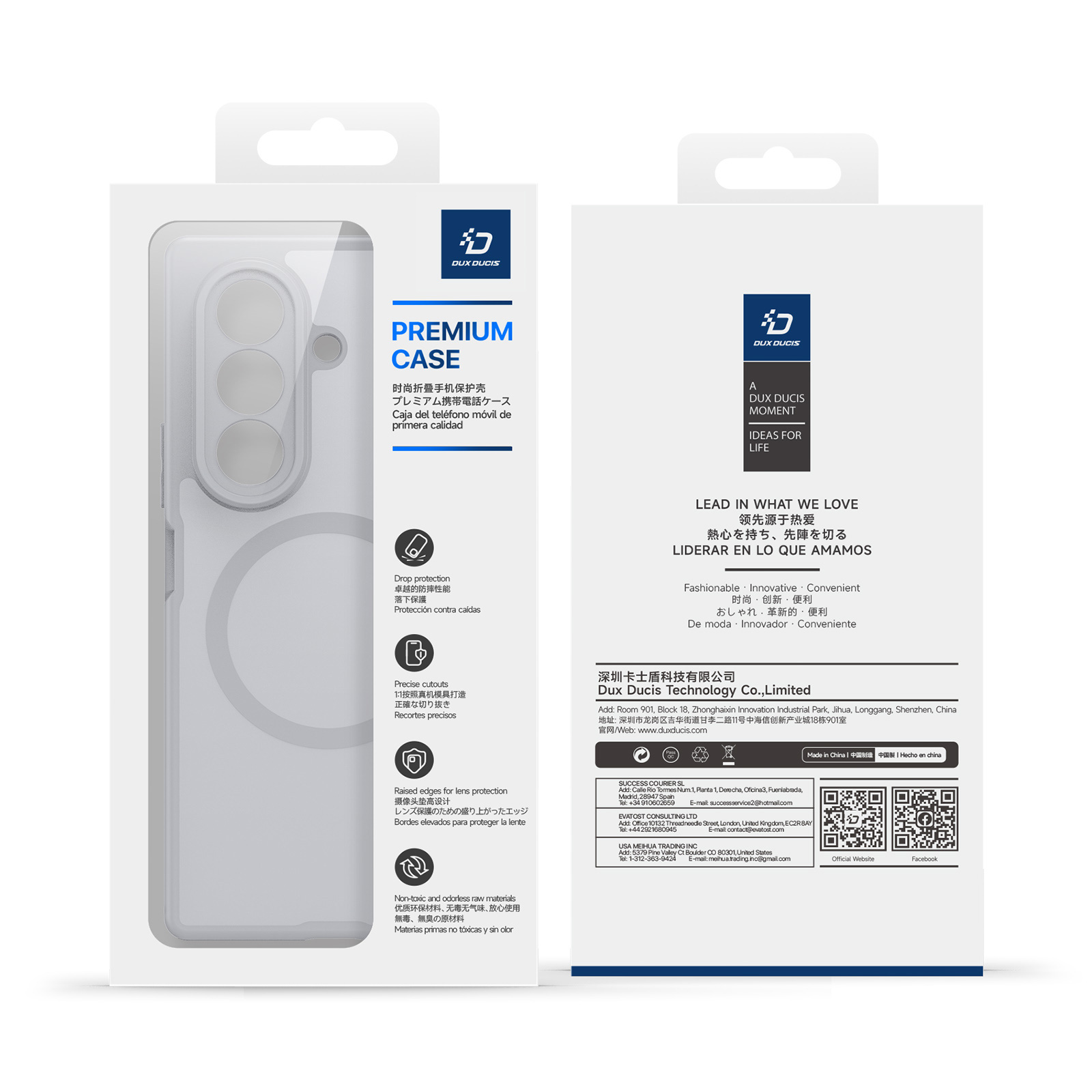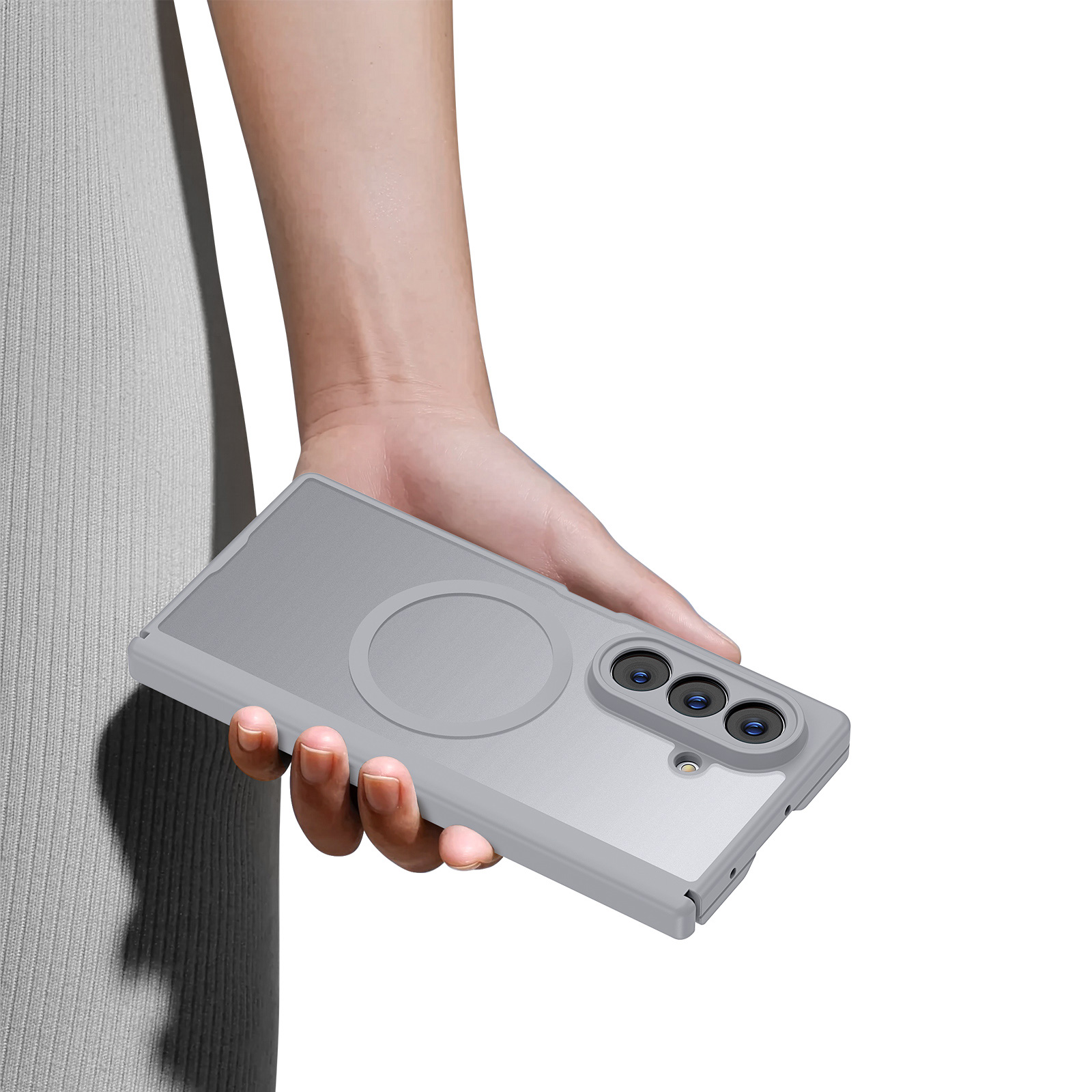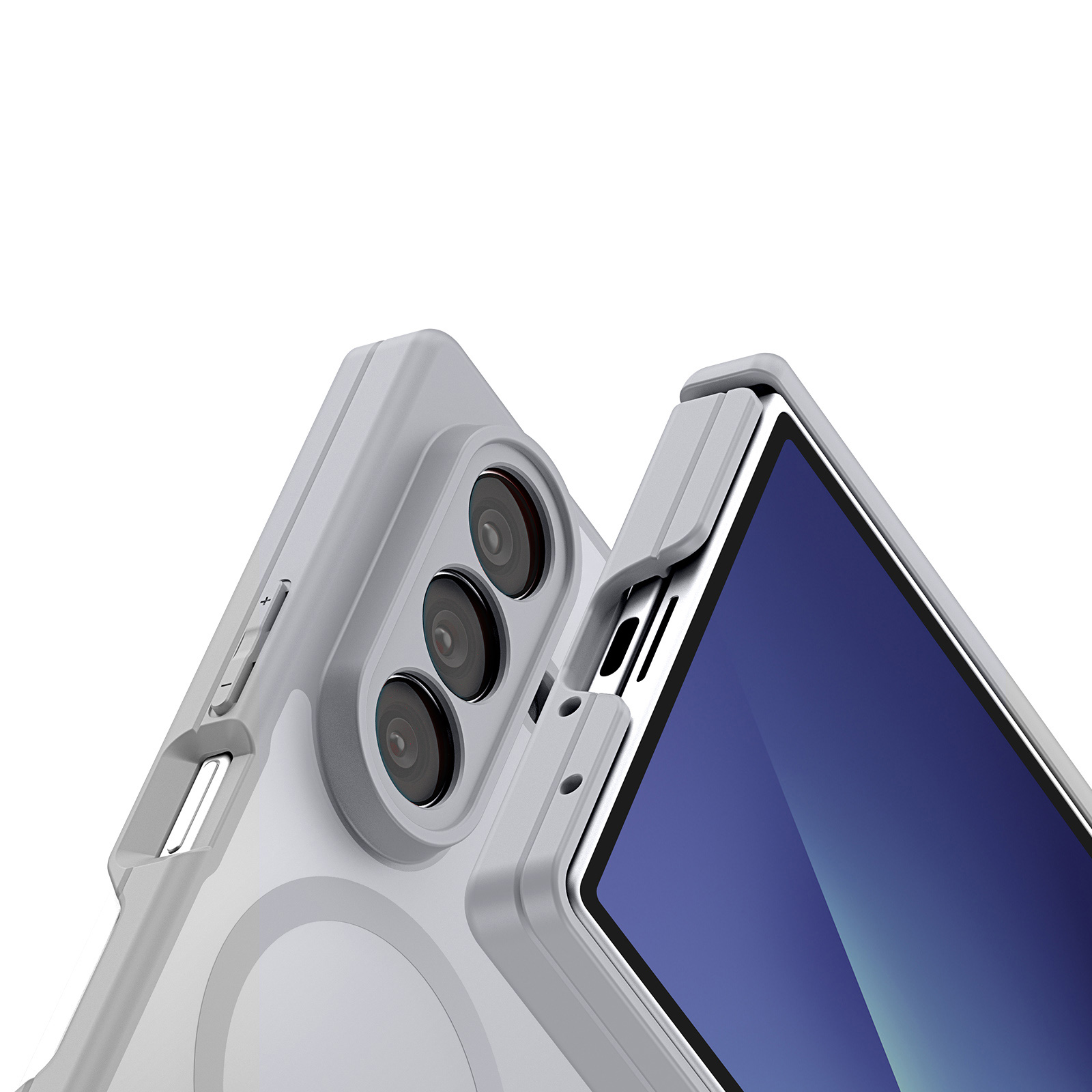 Усиленный противоударный чехол серого цвета с поддержкой беспроводной зарядки MagSage от Dux Ducis серии Expn Series Magnetic для смартфона Samsung Galaxy Z Fold 7. Покрытие Skin-Touch, улучшенное покрытие маслом для комфортного и надежного захвата при ежедневном использовании. Встроенное кольцо из 18 магнитов защищает шарнир и обеспечивает стабильную беспроводную зарядку.