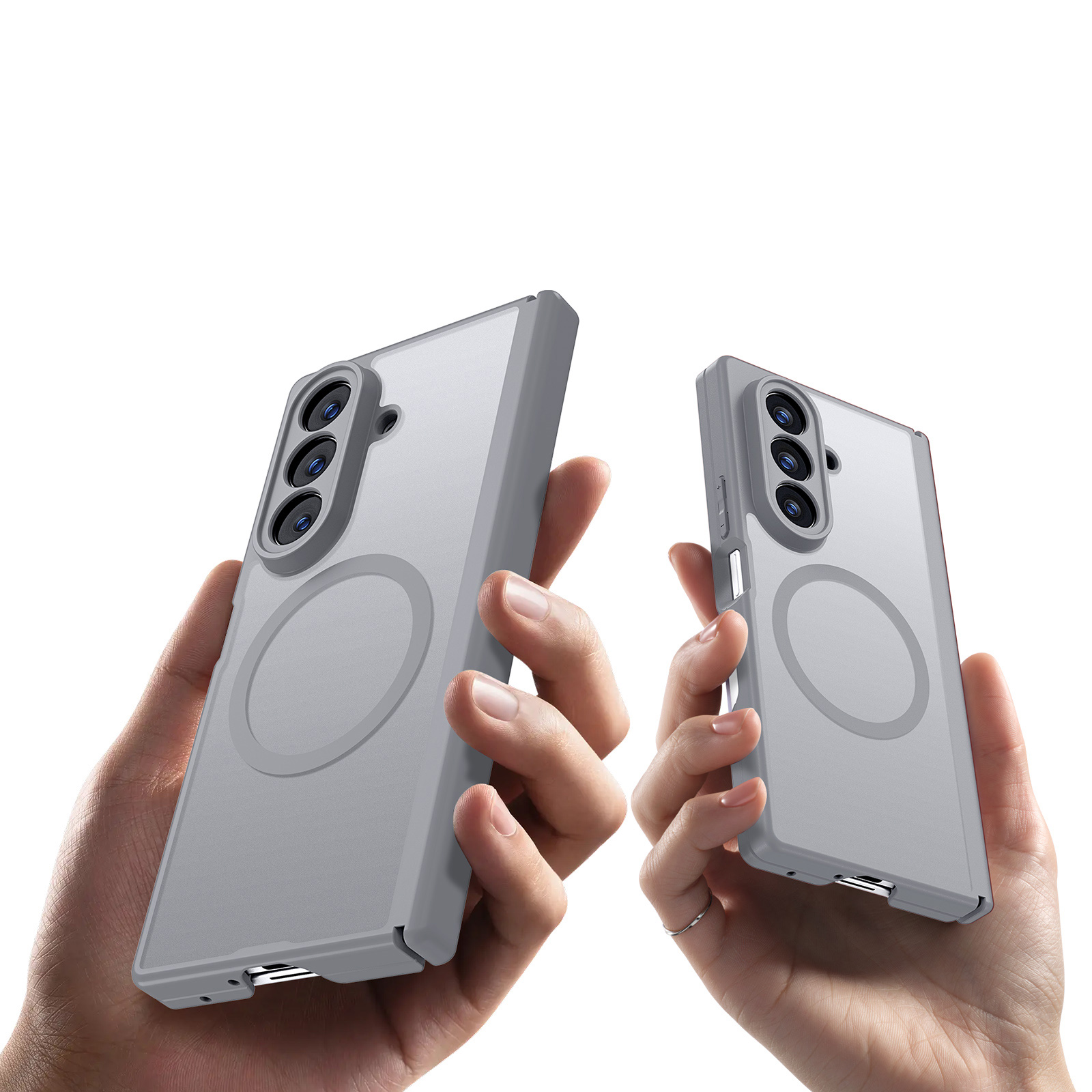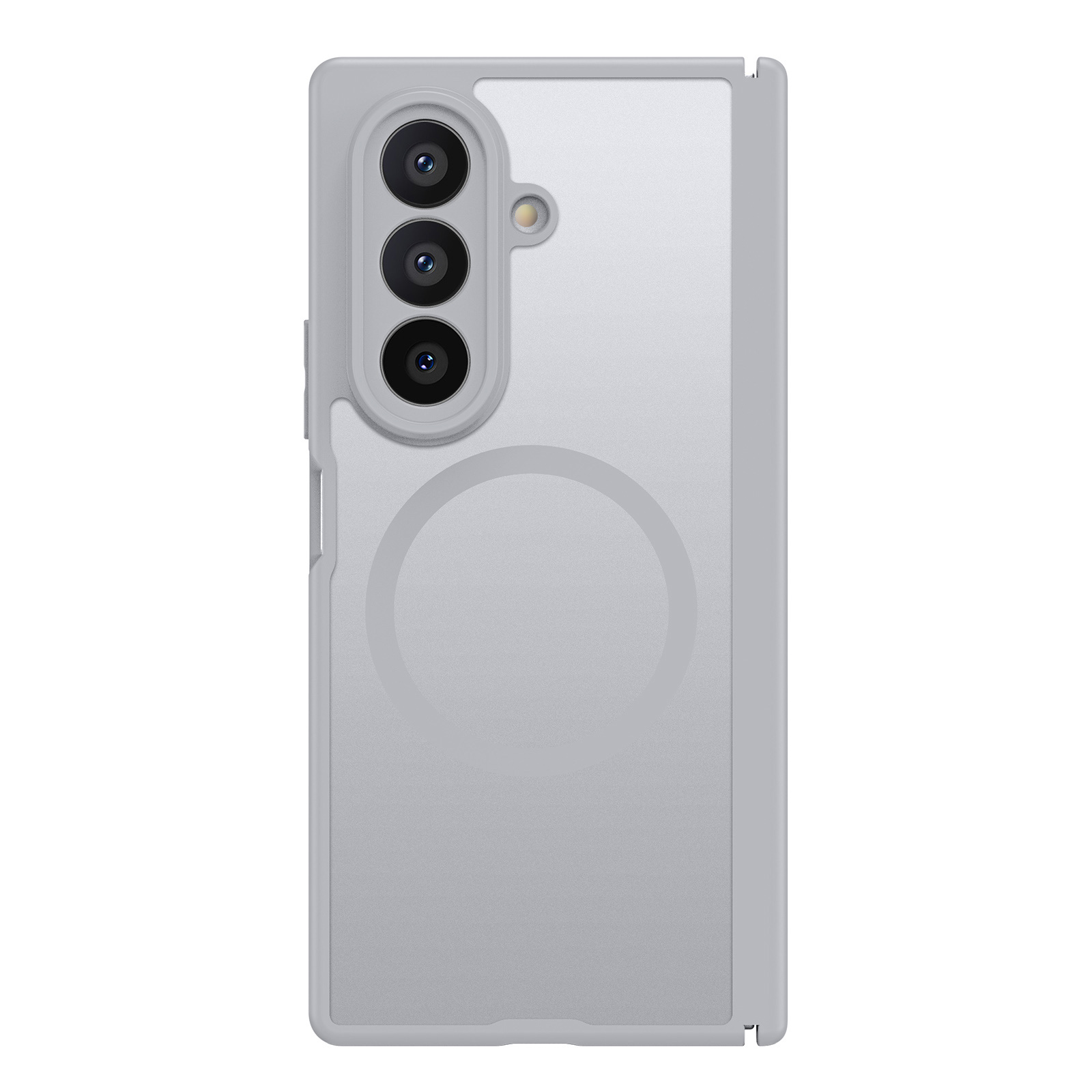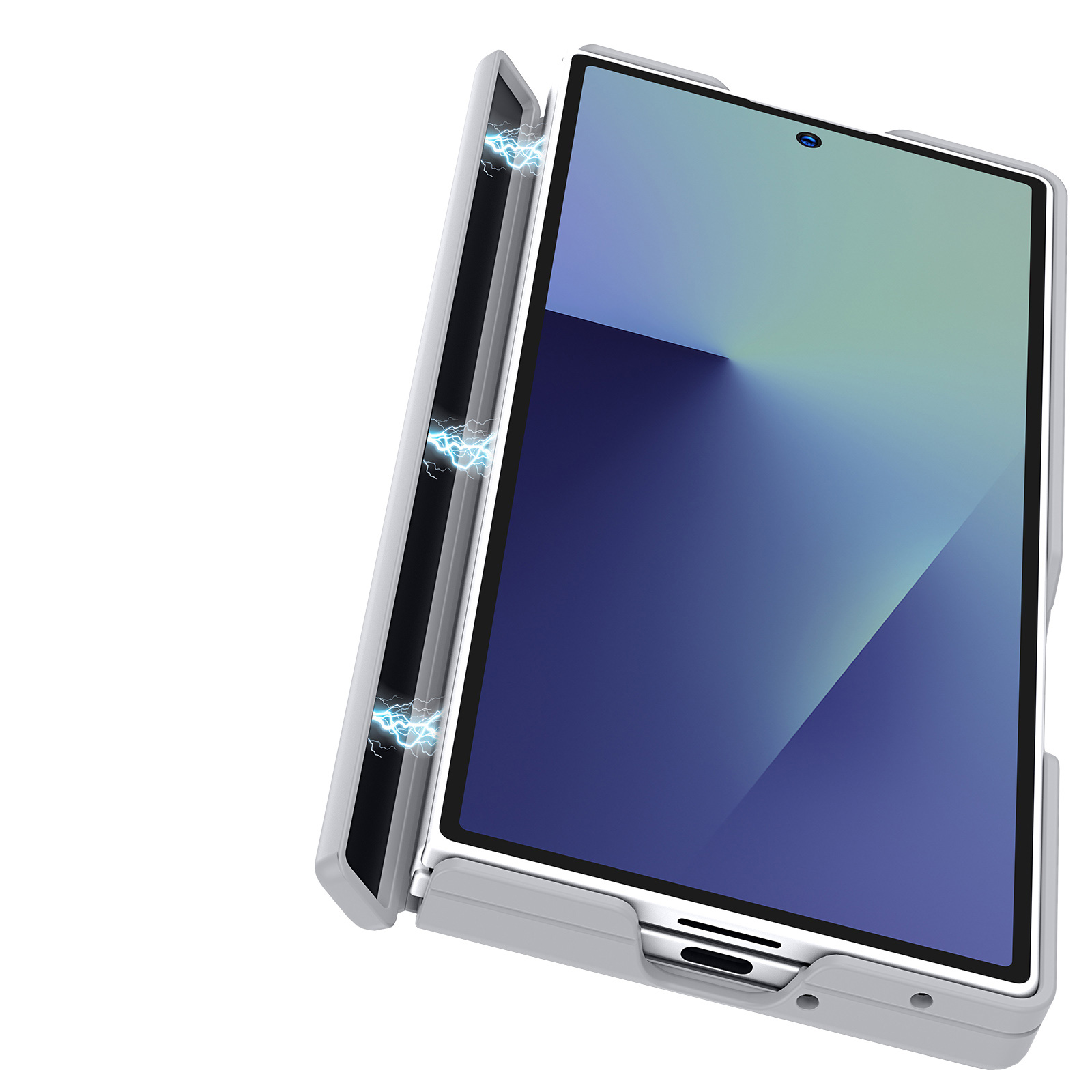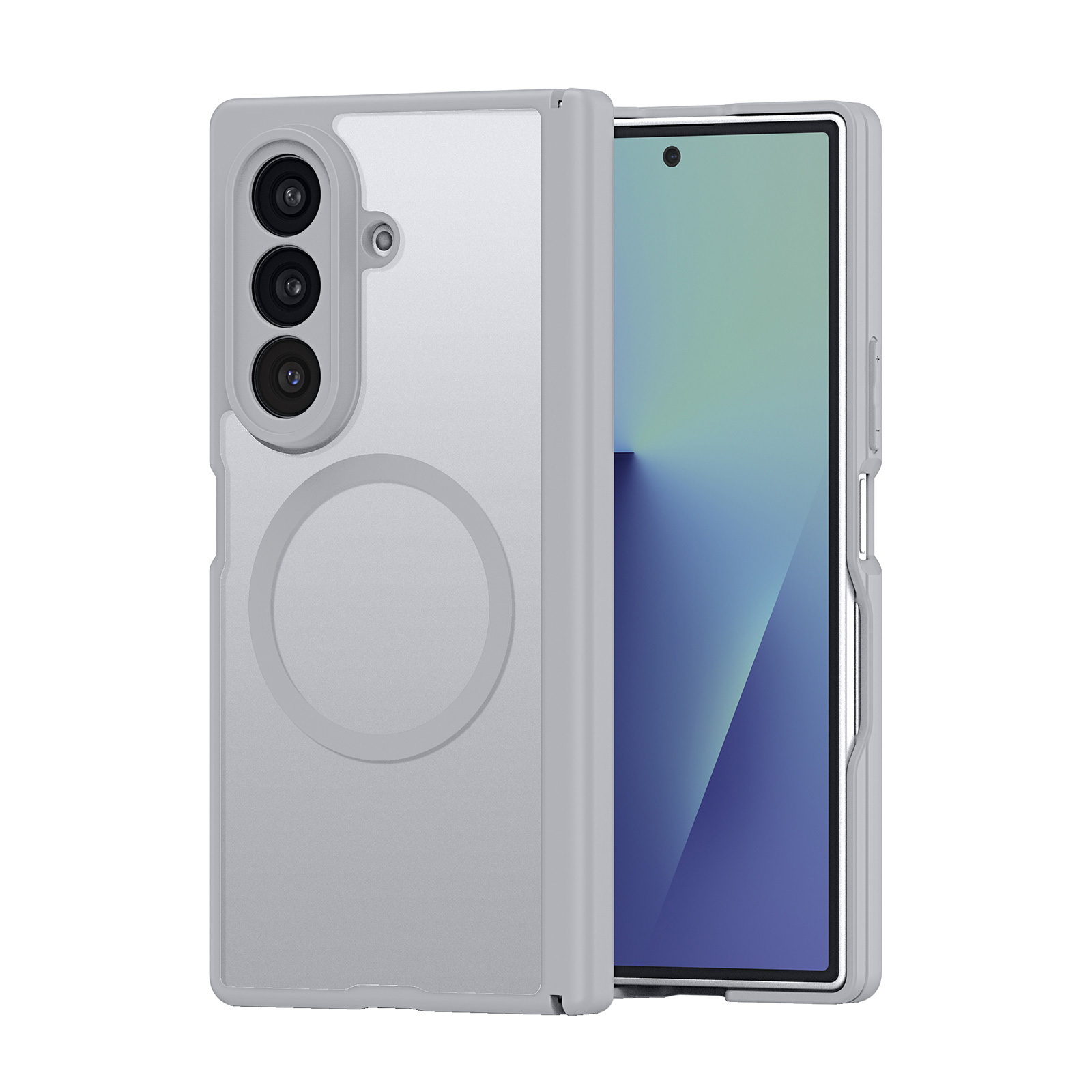 Усиленный противоударный чехол серого цвета с поддержкой беспроводной зарядки MagSage от Dux Ducis серии Expn Series Magnetic для смартфона Samsung Galaxy Z Fold 7. Покрытие Skin-Touch, улучшенное покрытие маслом для комфортного и надежного захвата при ежедневном использовании. Встроенное кольцо из 18 магнитов защищает шарнир и обеспечивает стабильную беспроводную зарядку.