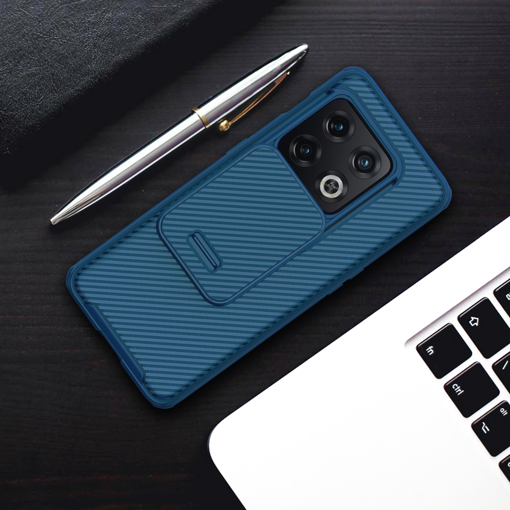 Противоударный чехол синего цвета с защитной шторкой задней камеры от Nillkin серии CamShield Pro Case для телефона OnePlus 10 Pro создан для любителей активного отдыха.