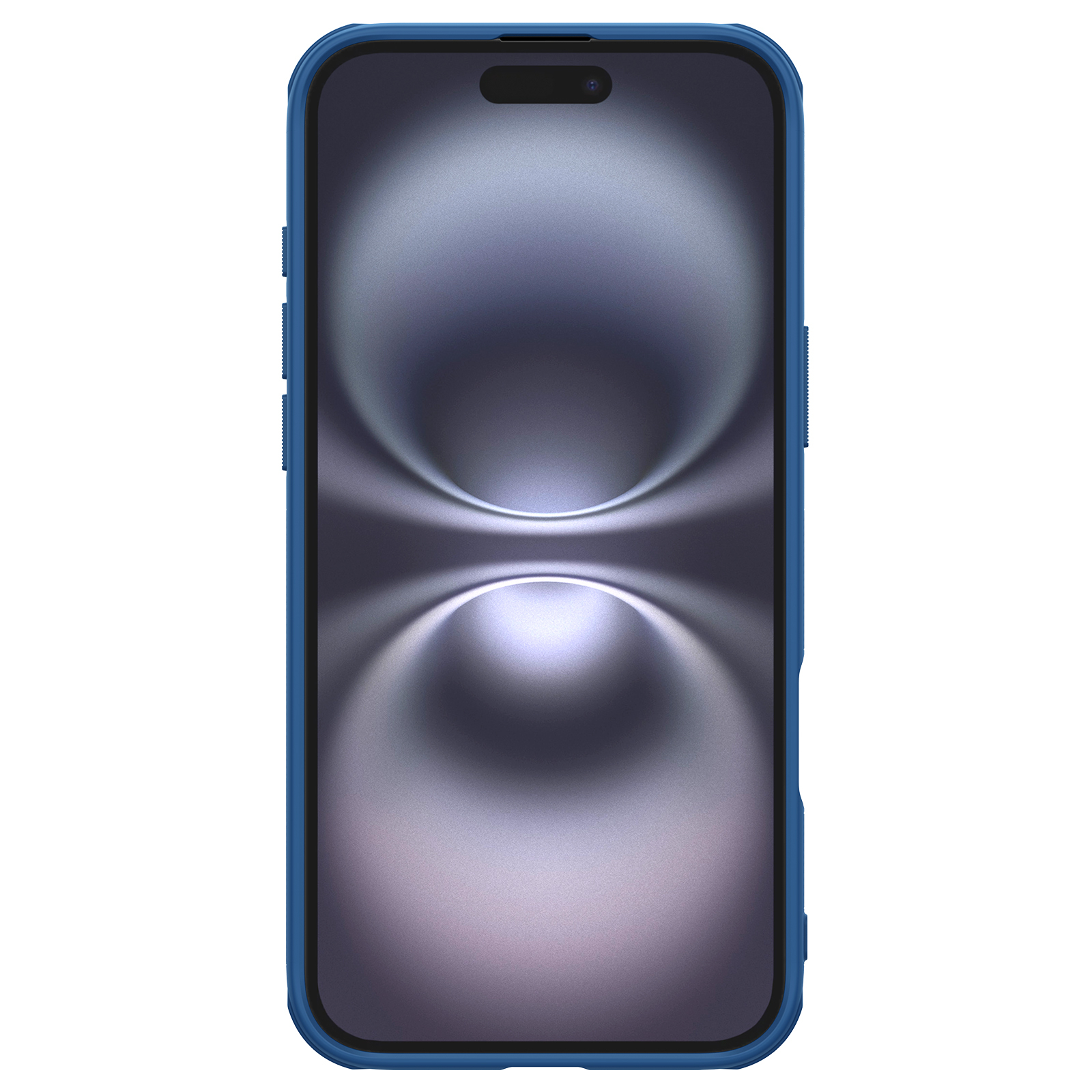 Защитный чехол синего цвета от Nillkin серии Super Frosted Shield для смартфона iPhone 16 с усиленными боковыми рамками по четырем углам, изготавливается из экологичных материалов PC и TPU путем высокоточного литья под давление с высокой температурой.