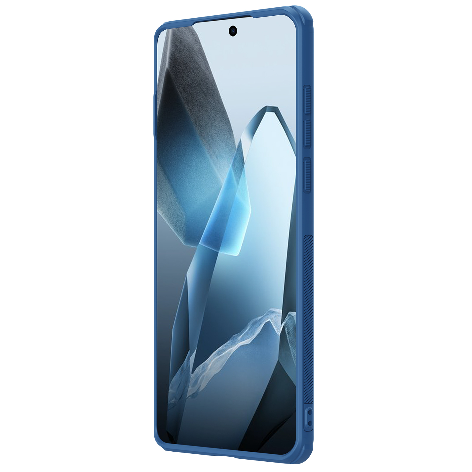 Защитный чехол синего цвета от Nillkin серии Super Frosted Shield Pro для смартфона OnePlus 13 с усиленными боковыми рамками по четырем углам, изготавливается из экологичных материалов PC и TPU путем высокоточного литья под давление с высокой температурой.