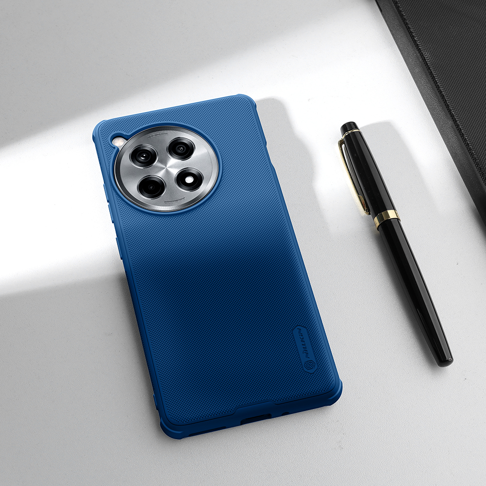 Защитный чехол синего цвета от Nillkin серии Super Frosted Shield для смартфона OnePlus 12R и Ace 3 с усиленными боковыми рамками по четырем углам, изготавливается из экологичных материалов PC и TPU путем высокоточного литья под давление с высокой температурой.