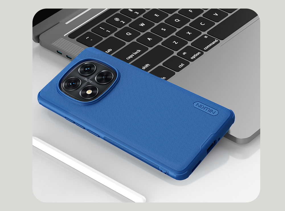 Защитный чехол синего цвета от Nillkin серии Super Frosted Shield для смартфона Xiaomi Redmi Note 14 Pro+ Плюс с усиленными боковыми рамками по четырем углам, изготавливается из экологичных материалов PC и TPU путем высокоточного литья под давление с высокой температурой.