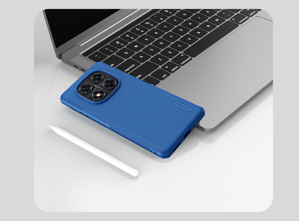 Защитный чехол синего цвета от Nillkin серии Super Frosted Shield для смартфона Xiaomi Redmi Note 14 Pro 5G и Mi Poco X7 5G с усиленными боковыми рамками по четырем углам, изготавливается из экологичных материалов PC и TPU путем высокоточного литья под давление с высокой температурой.