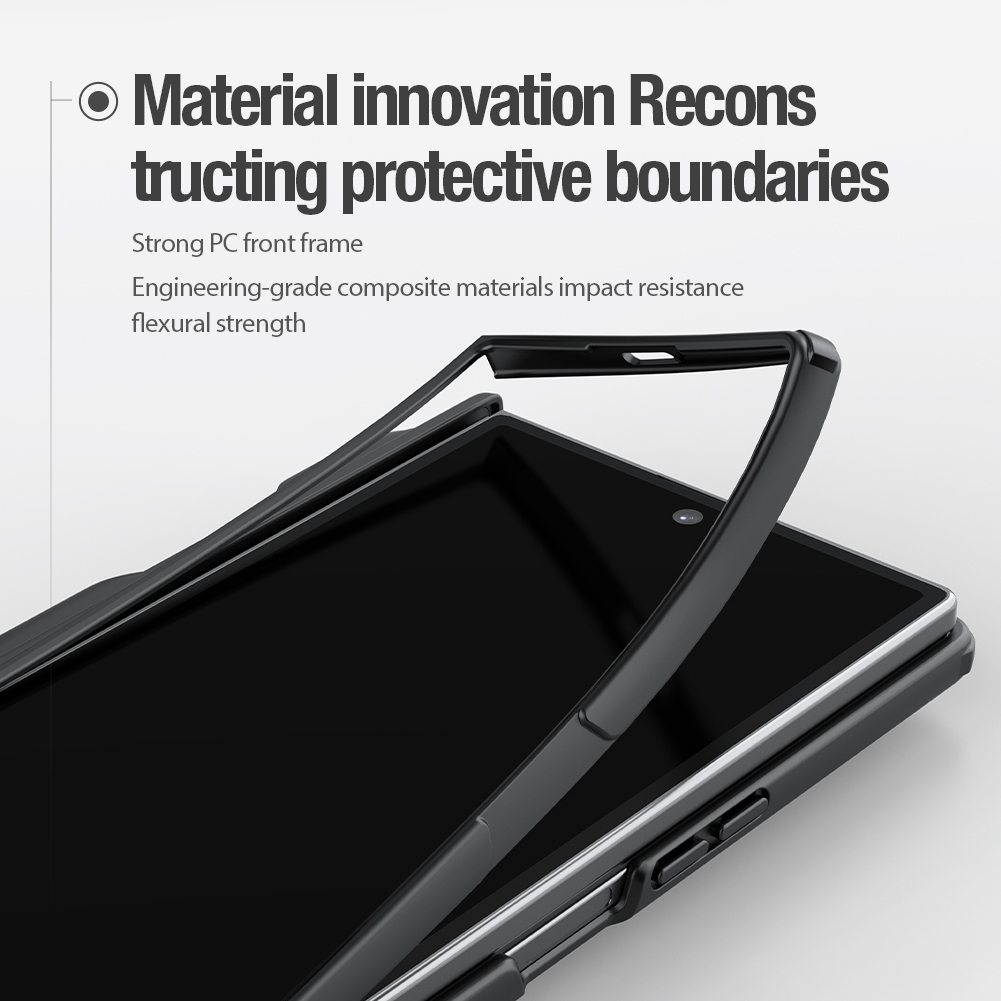 Противоударный чехол черного цвета от Nillkin серии Super Frosted Shield Fold (версия с S Pen в комплекте) с металлической рамкой вокруг линз на смартфон Samsung Galaxy Z Fold 7 создан для любителей активного отдыха.