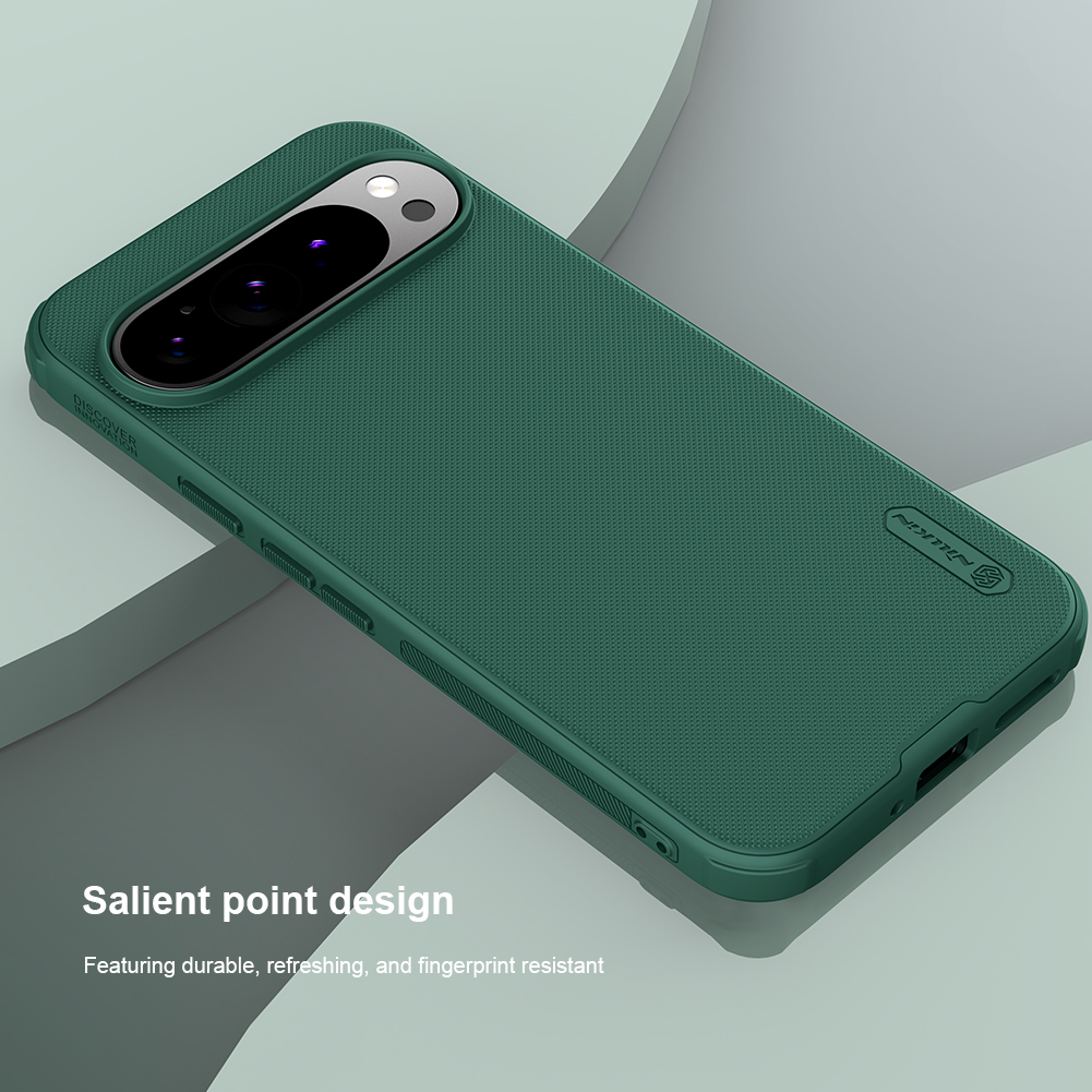 Защитный чехол зеленого цвета (Dark Green) от Nillkin серии Super Frosted Shield Pro для смартфона Google Pixel 9 и 9 Pro с усиленными боковыми рамками по четырем углам, изготавливается из экологичных материалов PC и TPU путем высокоточного литья под давление с высокой температурой.