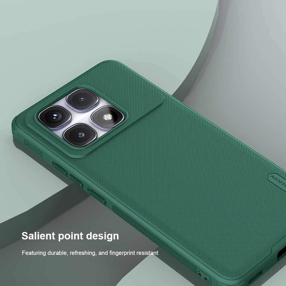 Защитный чехол зеленого цвета (Dark Green) от Nillkin серии Super Frosted Shield для смартфона Xiaomi Redmi K70 Ultra с усиленными боковыми рамками по четырем углам, изготавливается из экологичных материалов PC и TPU путем высокоточного литья под давление с высокой температурой.
