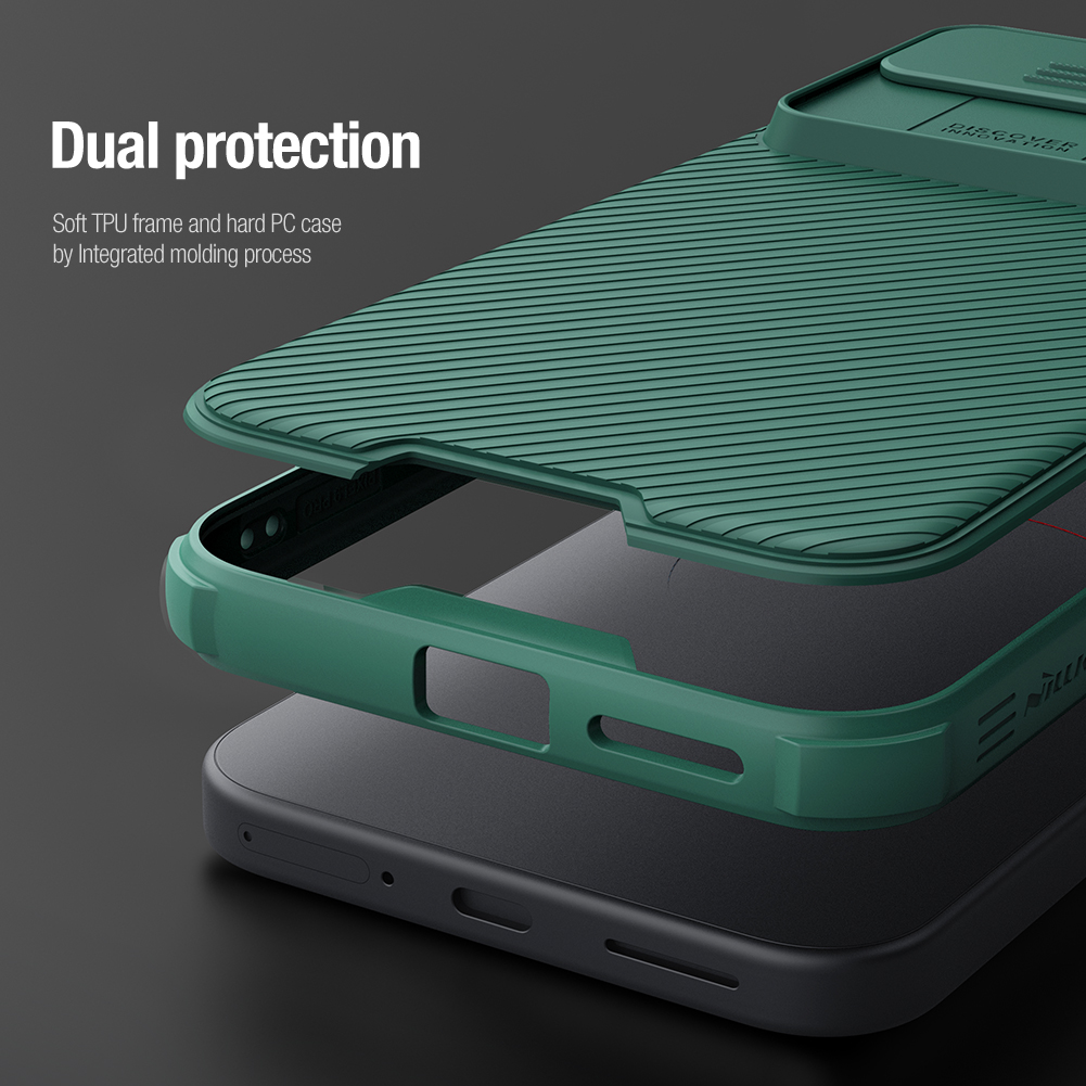 Противоударный чехол зеленого цвета (Dark Green) с защитной шторкой задней камеры от Nillkin серии CamShield Pro Case для телефона Google Pixel 9 Pro создан для любителей активного отдыха.