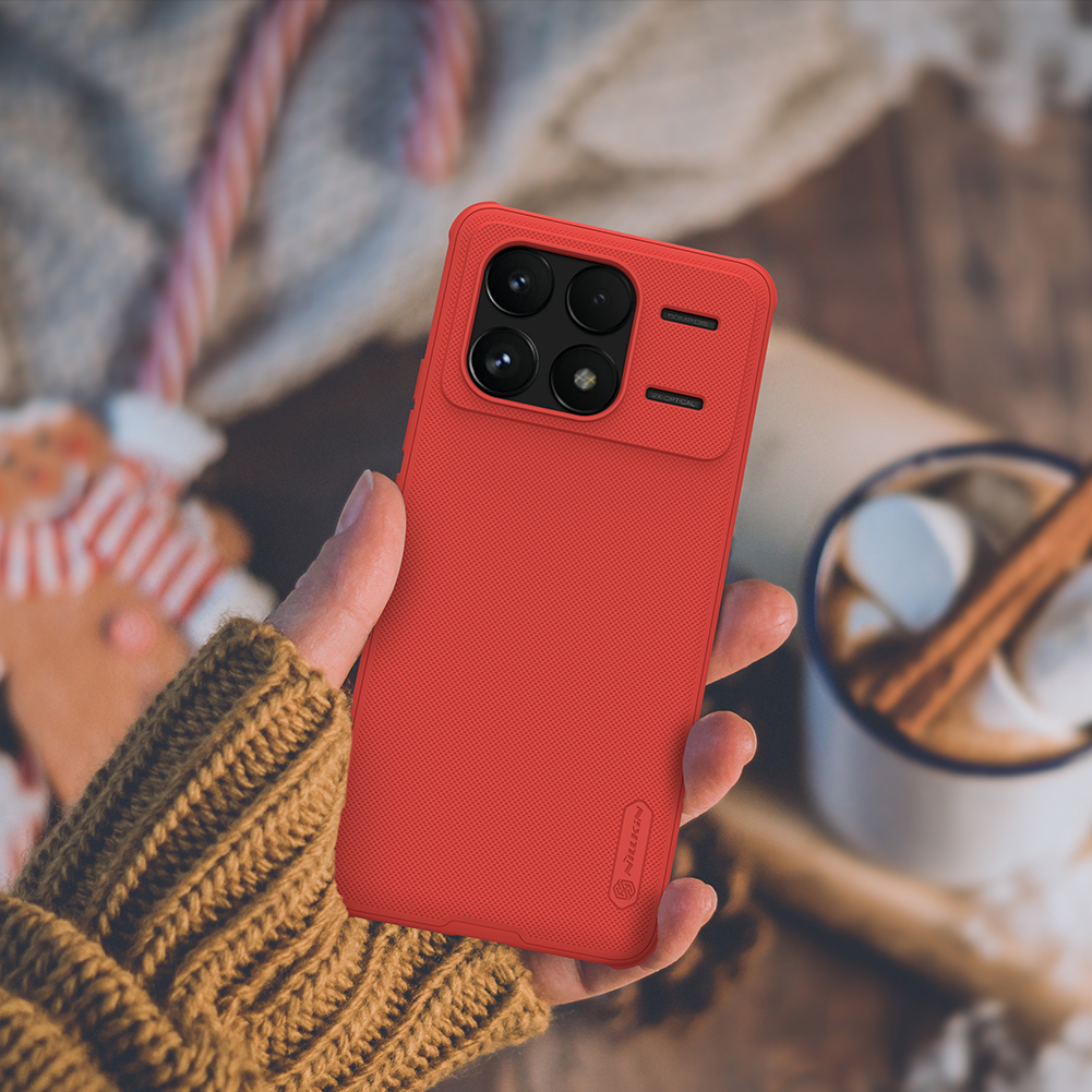 Защитный чехол красного цвета от Nillkin серии Super Frosted Shield Pro для смартфона Xiaomi Poco F6 Pro с усиленными боковыми рамками по четырем углам, изготавливается из экологичных материалов PC и TPU путем высокоточного литья под давление с высокой температурой.