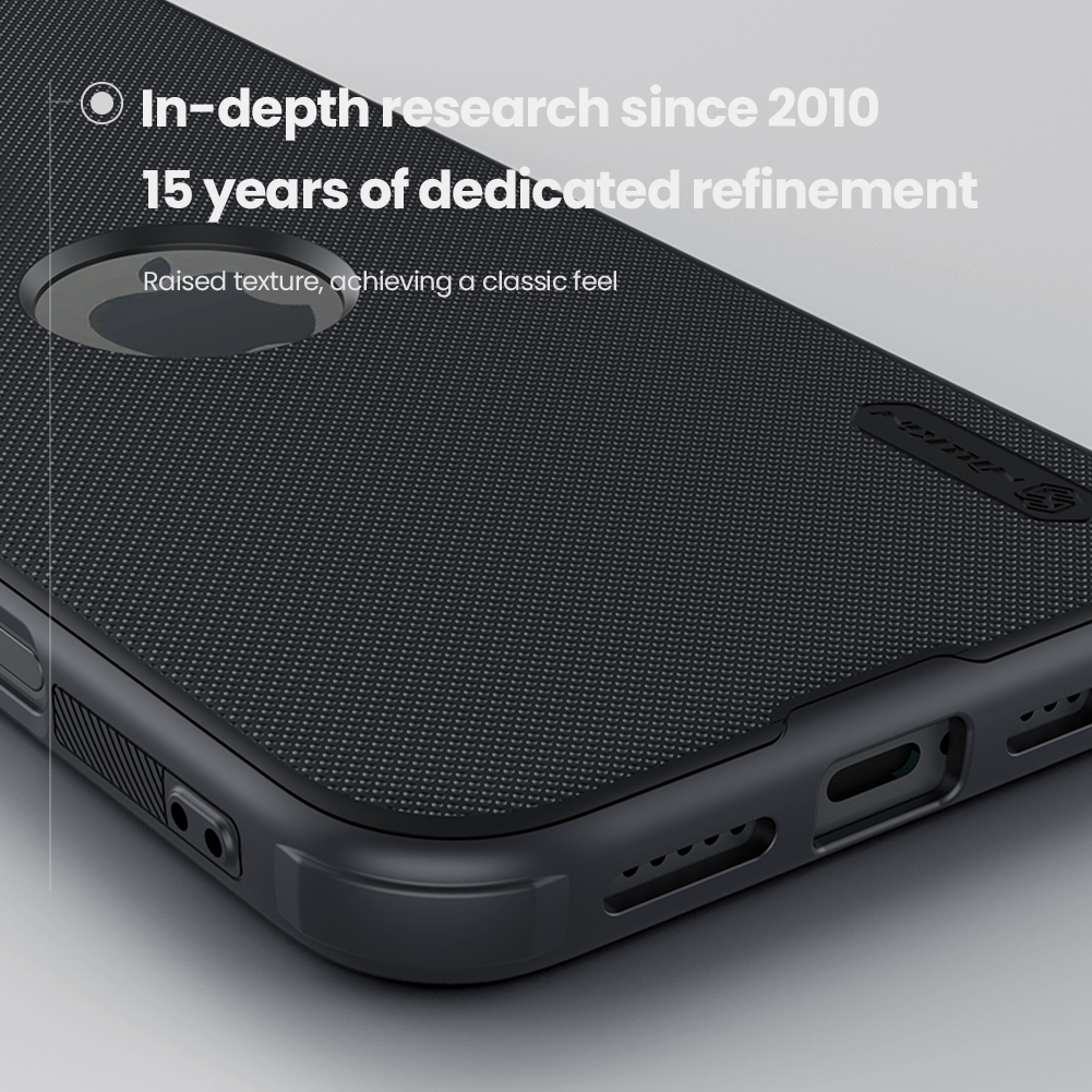 Защитный чехол черного цвета от Nillkin серии Super Frosted Shield (версия с вырезом под лого) для смартфона iPhone 16 Plus с усиленными боковыми рамками по четырем углам, изготавливается из экологичных материалов PC и TPU путем высокоточного литья под давление с высокой температурой.