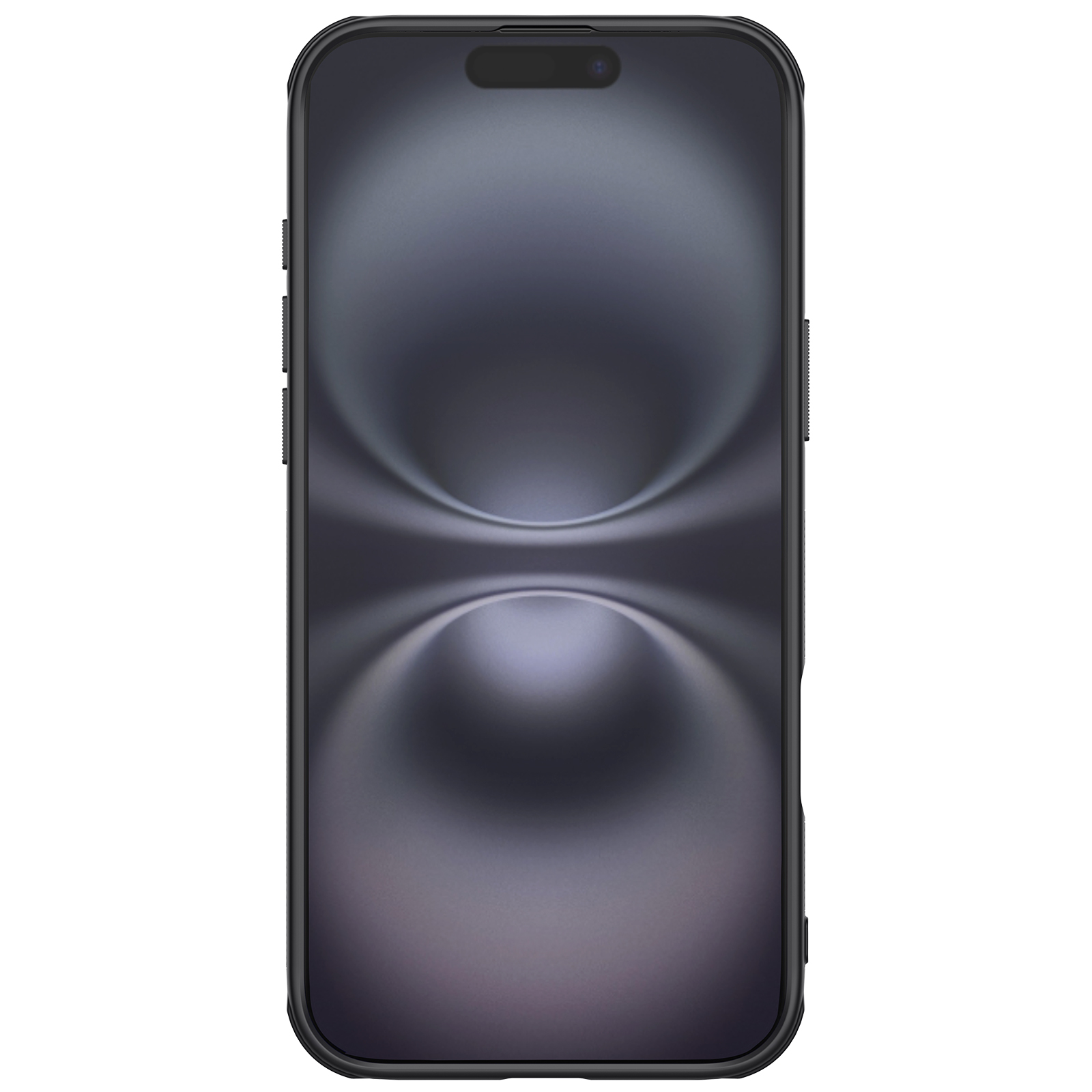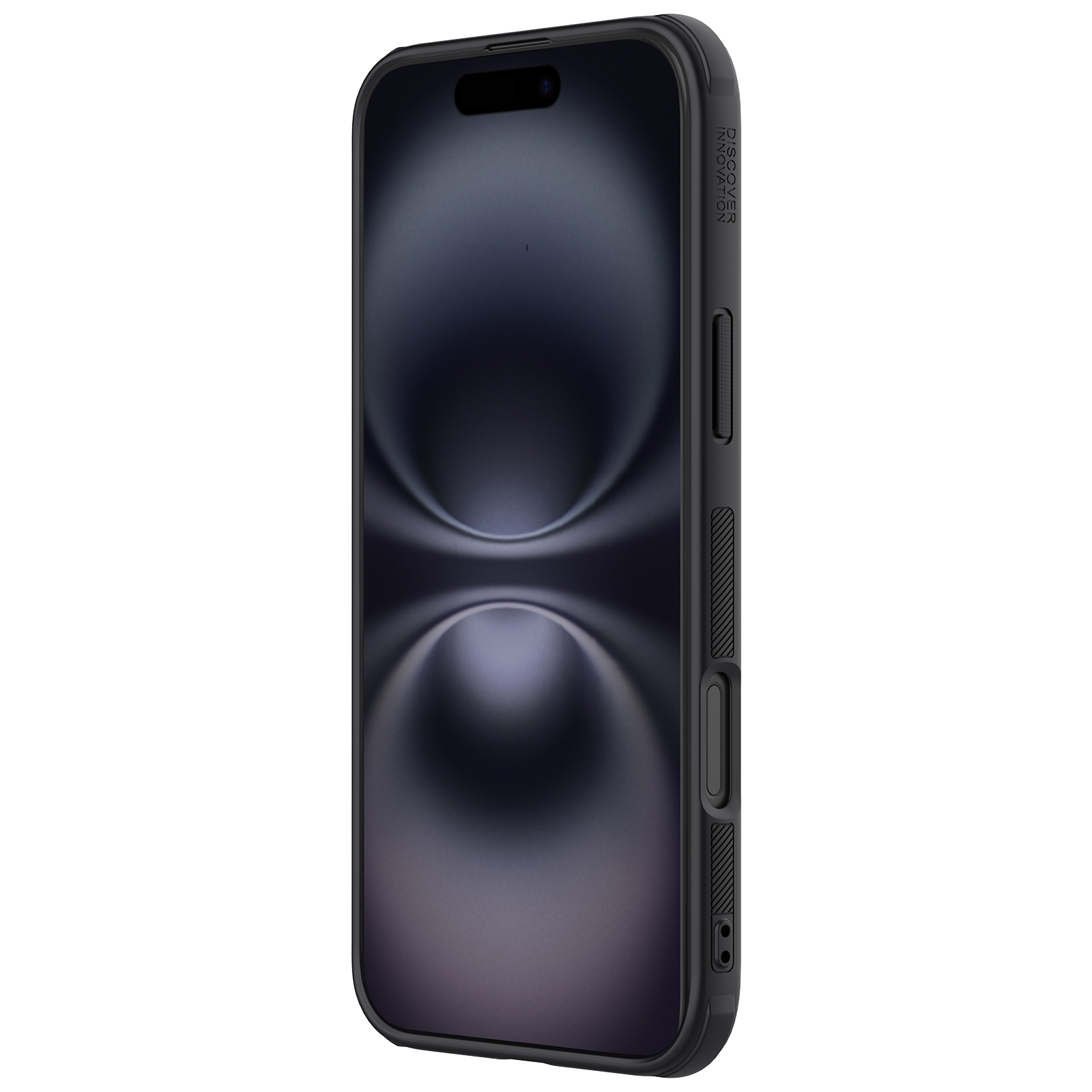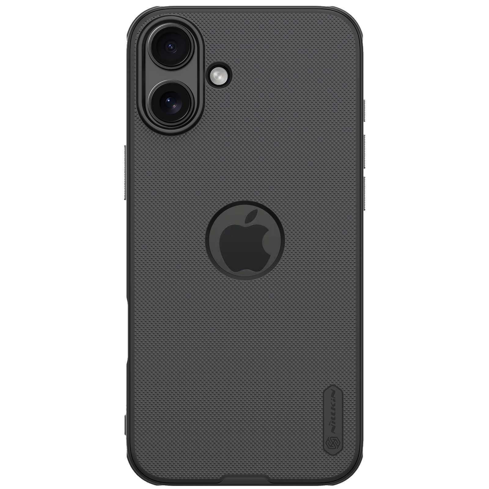 Защитный чехол черного цвета от Nillkin серии Super Frosted Shield (версия с вырезом под лого) для смартфона iPhone 16 с усиленными боковыми рамками по четырем углам, изготавливается из экологичных материалов PC и TPU путем высокоточного литья под давление с высокой температурой.