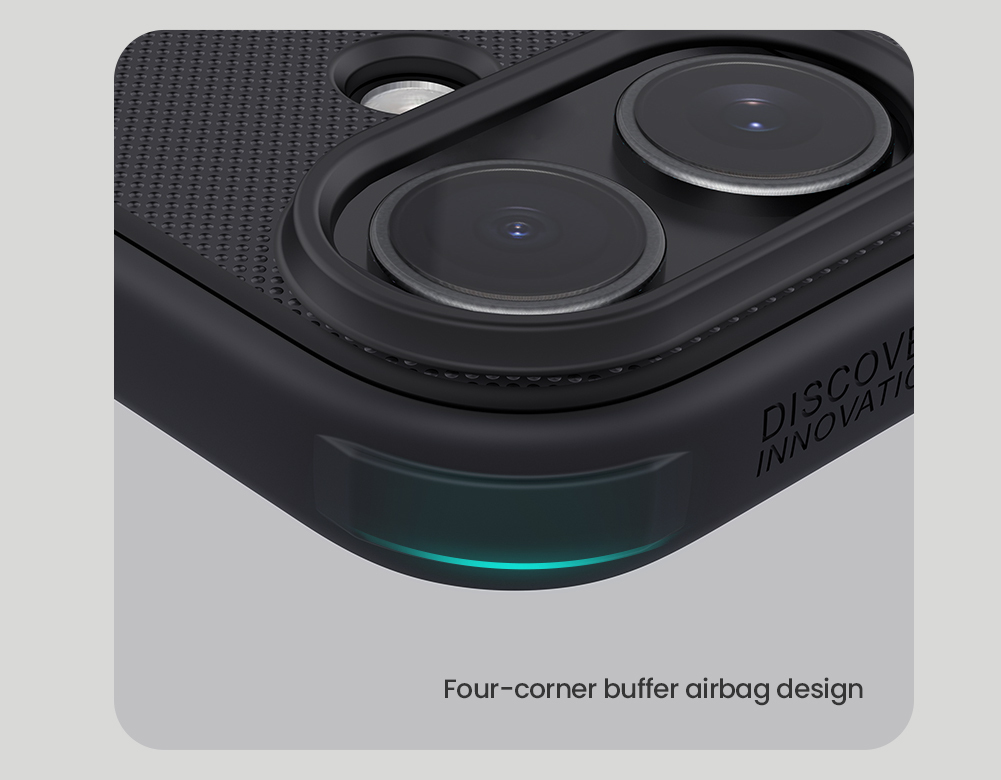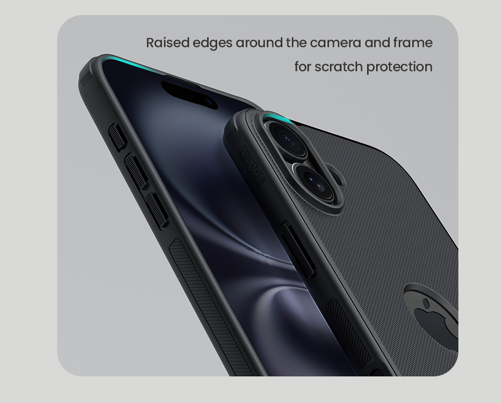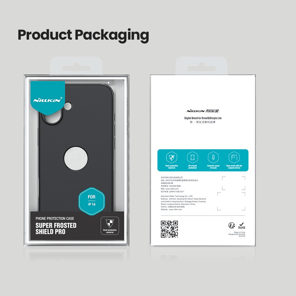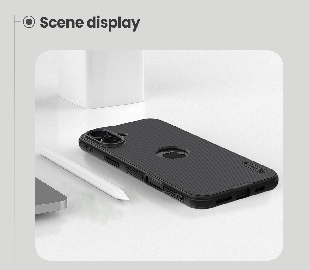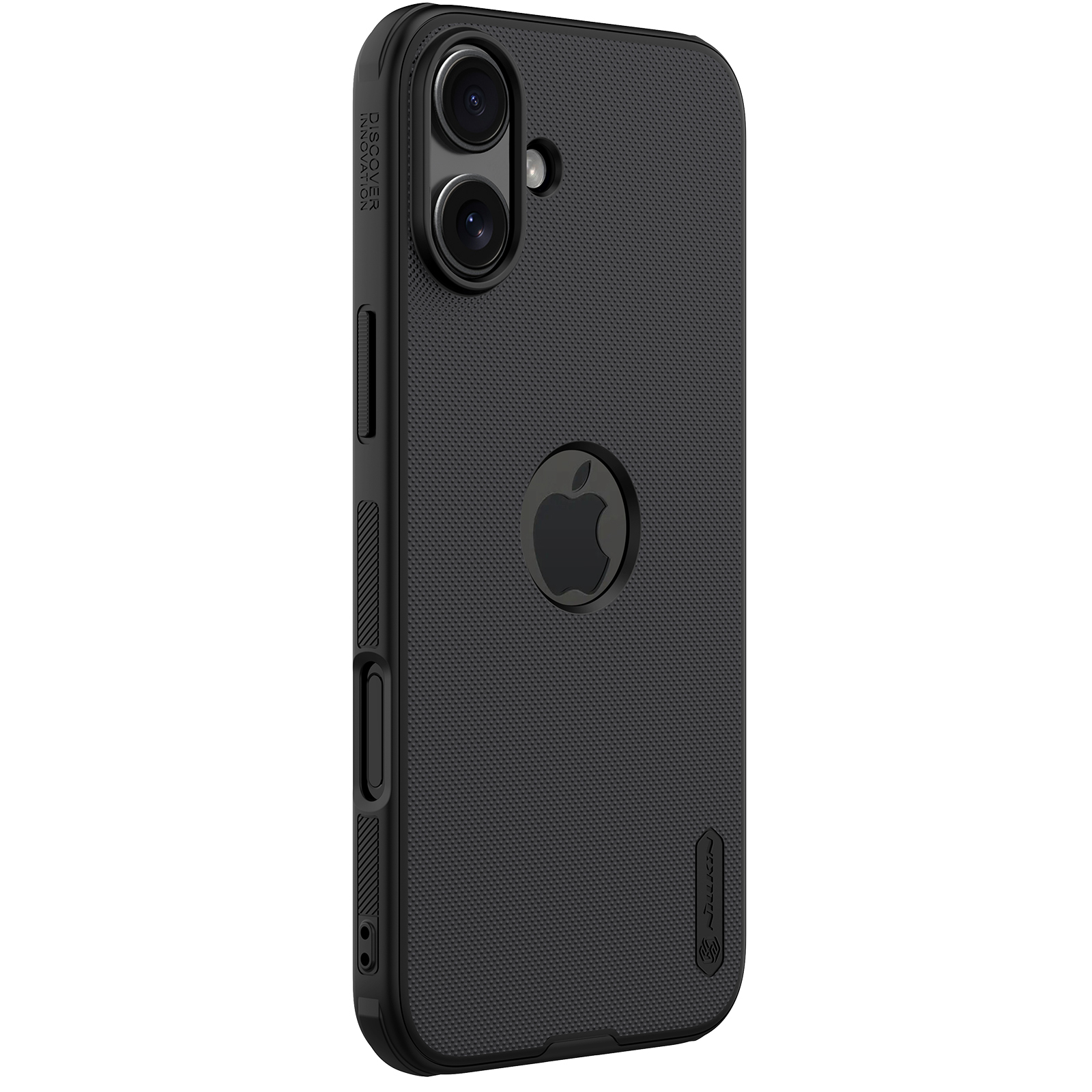 Защитный чехол черного цвета от Nillkin серии Super Frosted Shield (версия с вырезом под лого) для смартфона iPhone 16 с усиленными боковыми рамками по четырем углам, изготавливается из экологичных материалов PC и TPU путем высокоточного литья под давление с высокой температурой.