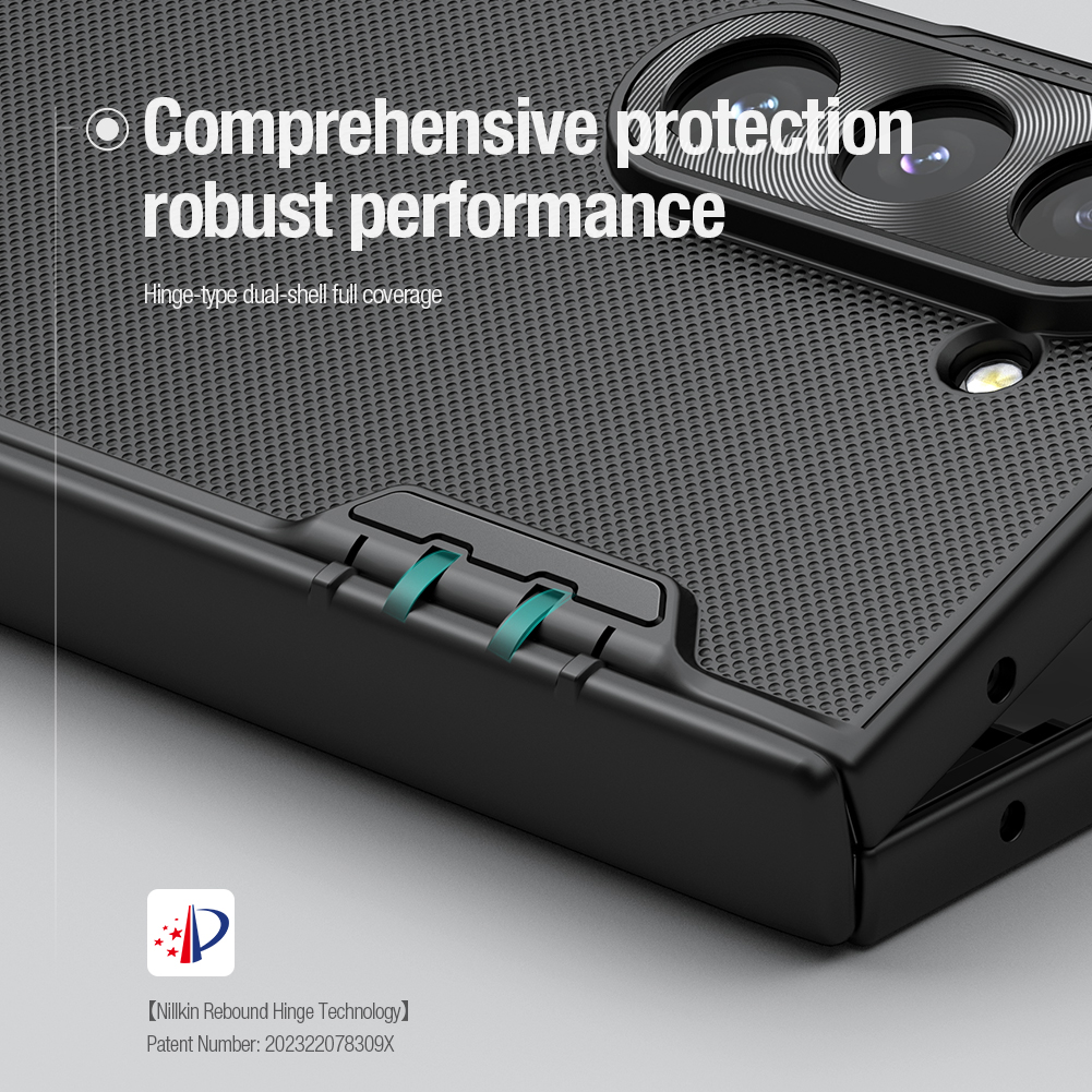 Противоударный чехол черного цвета от Nillkin серии Super Frosted Shield Fold с металлической рамкой вокруг линз на смартфон Samsung Galaxy Z Fold 6 5G создан для любителей активного отдыха.