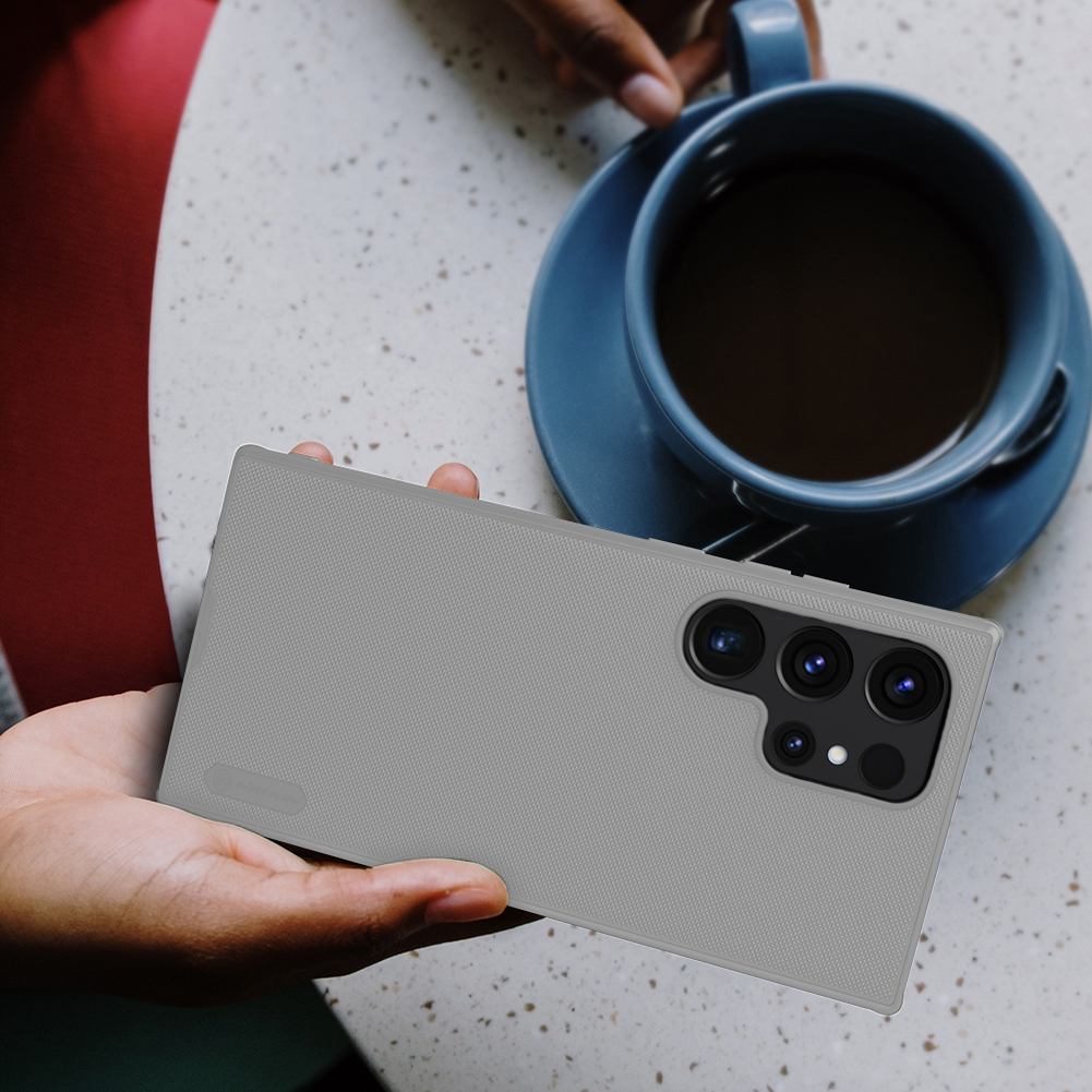Усиленный защитный чехол серого цвета (Titanium Gray) от Nillkin серии Super Frosted Shield для смартфона Samsung Galaxy S24 Ultra с усиленными боковыми рамками по четырем углам, изготавливается из экологичных материалов PC и TPU путем высокоточного литья под давление с высокой температурой.