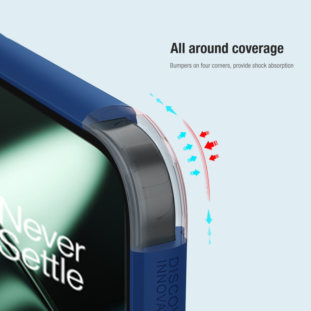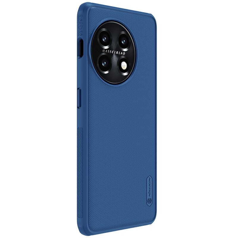 Защитный чехол синего цвета от Nillkin серии Super Frosted Shield для смартфона Oneplus 11 с усиленными боковыми рамками по четырем углам, изготавливается из экологичных материалов PC и TPU путем высокоточного литья под давление с высокой температурой.