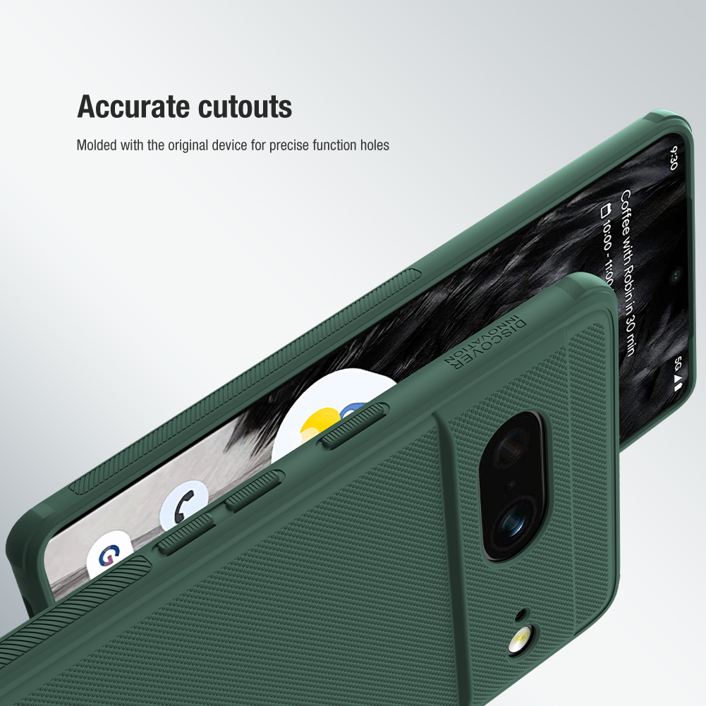 Защитный чехол зеленого цвета от Nillkin серии Super Frosted Shield для смартфона Google Pixel 7 с усиленными боковыми рамками по четырем углам, изготавливается из экологичных материалов PC и TPU путем высокоточного литья под давление с высокой температурой.