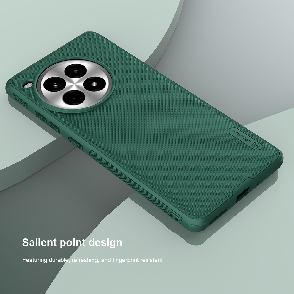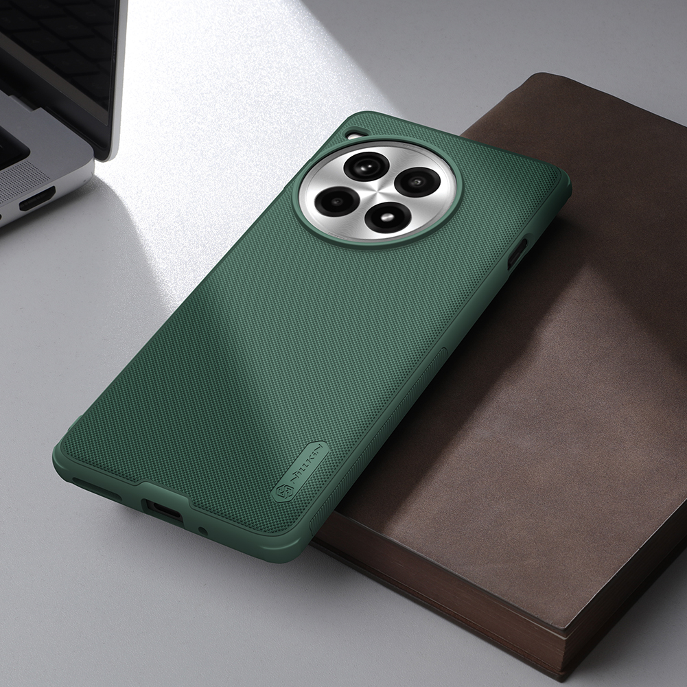 Защитный чехол зеленого цвета (Dark Green) от Nillkin серии Super Frosted Shield для смартфона OnePlus Ace 3 Pro с усиленными боковыми рамками по четырем углам, изготавливается из экологичных материалов PC и TPU путем высокоточного литья под давление с высокой температурой.