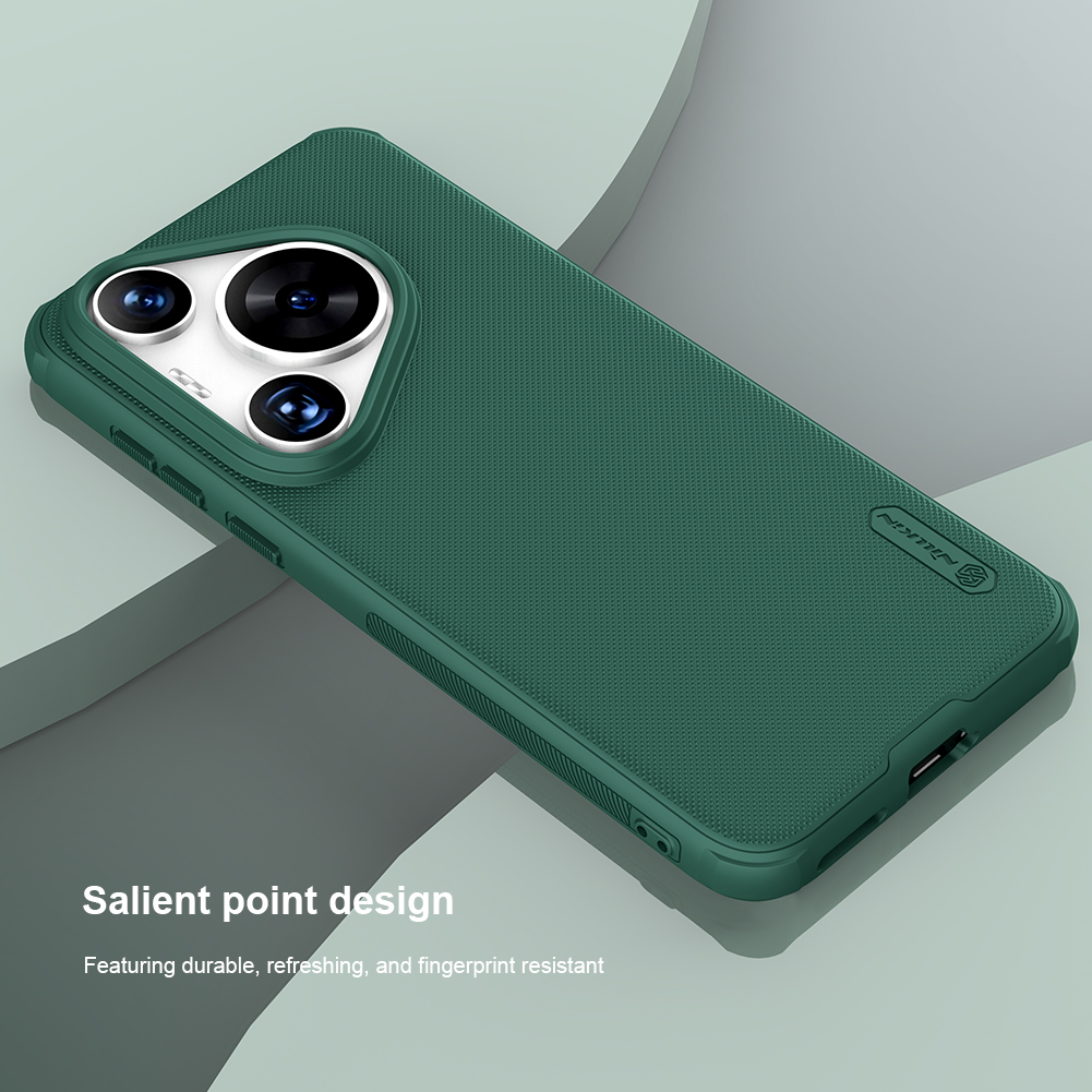 Защитный чехол зеленого цвета (Deep Green) от Nillkin серии Super Frosted Shield Pro для смартфона Huawei Pura 70 с усиленными боковыми рамками по четырем углам, изготавливается из экологичных материалов PC и TPU путем высокоточного литья под давление с высокой температурой.