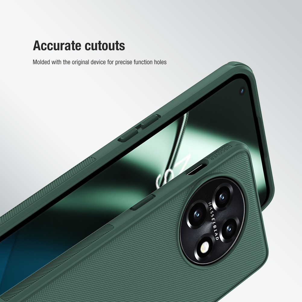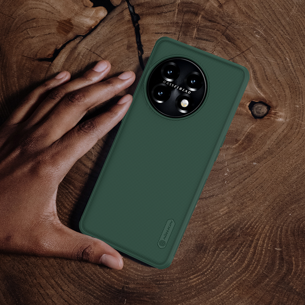 Защитный чехол зеленого цвета от Nillkin серии Super Frosted Shield для смартфона Oneplus 11 с усиленными боковыми рамками по четырем углам, изготавливается из экологичных материалов PC и TPU путем высокоточного литья под давление с высокой температурой.