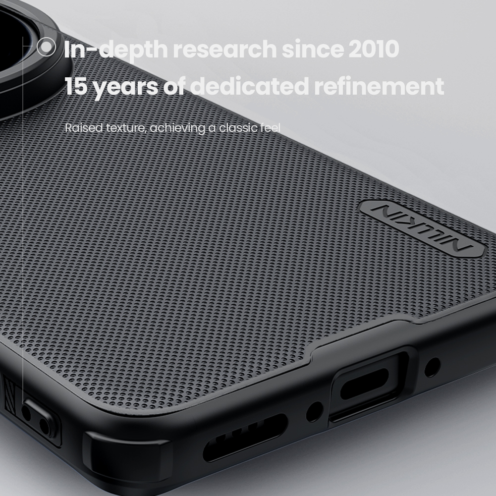 Защитный чехол черного цвета от Nillkin серии Super Frosted Shield Pro для смартфона Vivo X200 Ultra с усиленными боковыми рамками по четырем углам, изготавливается из экологичных материалов PC и TPU путем высокоточного литья под давление с высокой температурой.