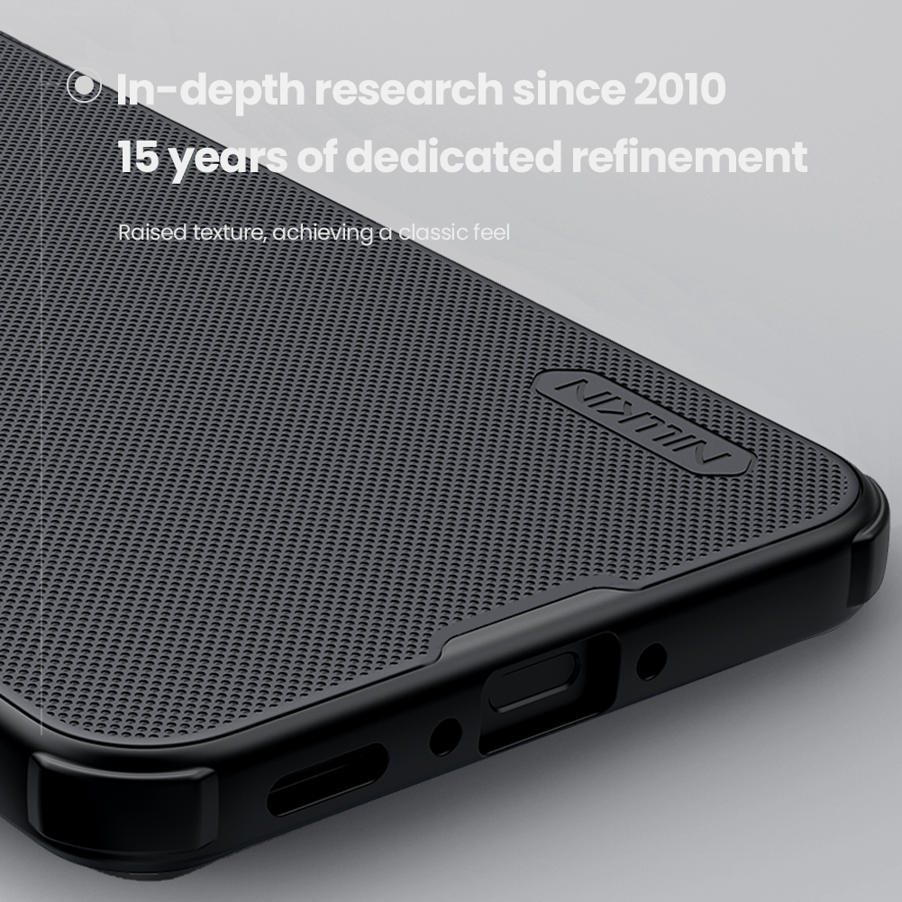 Защитный чехол черного цвета от Nillkin серии Super Frosted Shield Pro для смартфона Samsung Galaxy A56 5G с усиленными боковыми рамками по четырем углам, изготавливается из экологичных материалов PC и TPU путем высокоточного литья под давление с высокой температурой.