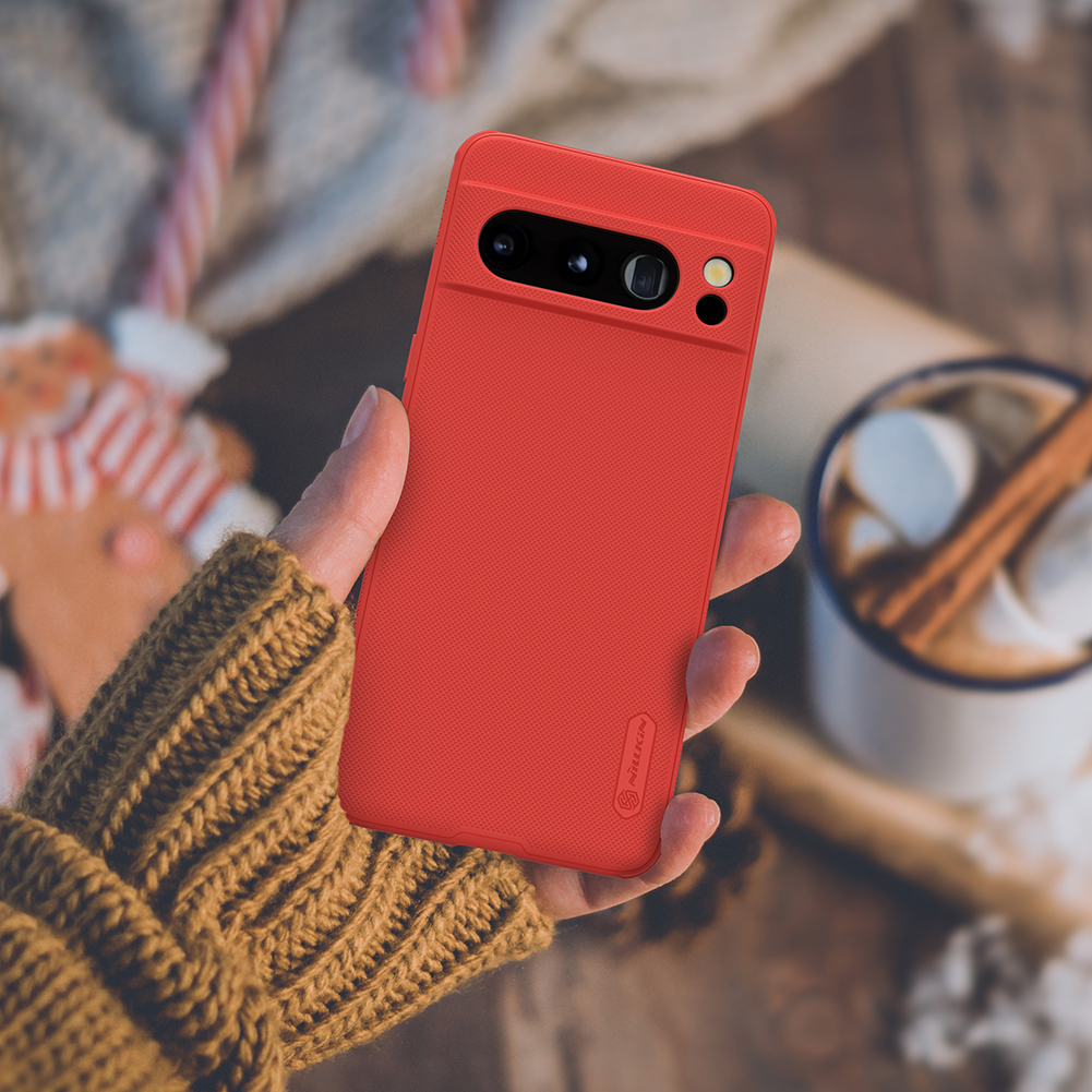 Защитный чехол красного цвета от Nillkin серии Super Frosted Shield Pro для смартфона Google Pixel 8 Pro с усиленными боковыми рамками по четырем углам, изготавливается из экологичных материалов PC и TPU путем высокоточного литья под давление с высокой температурой.