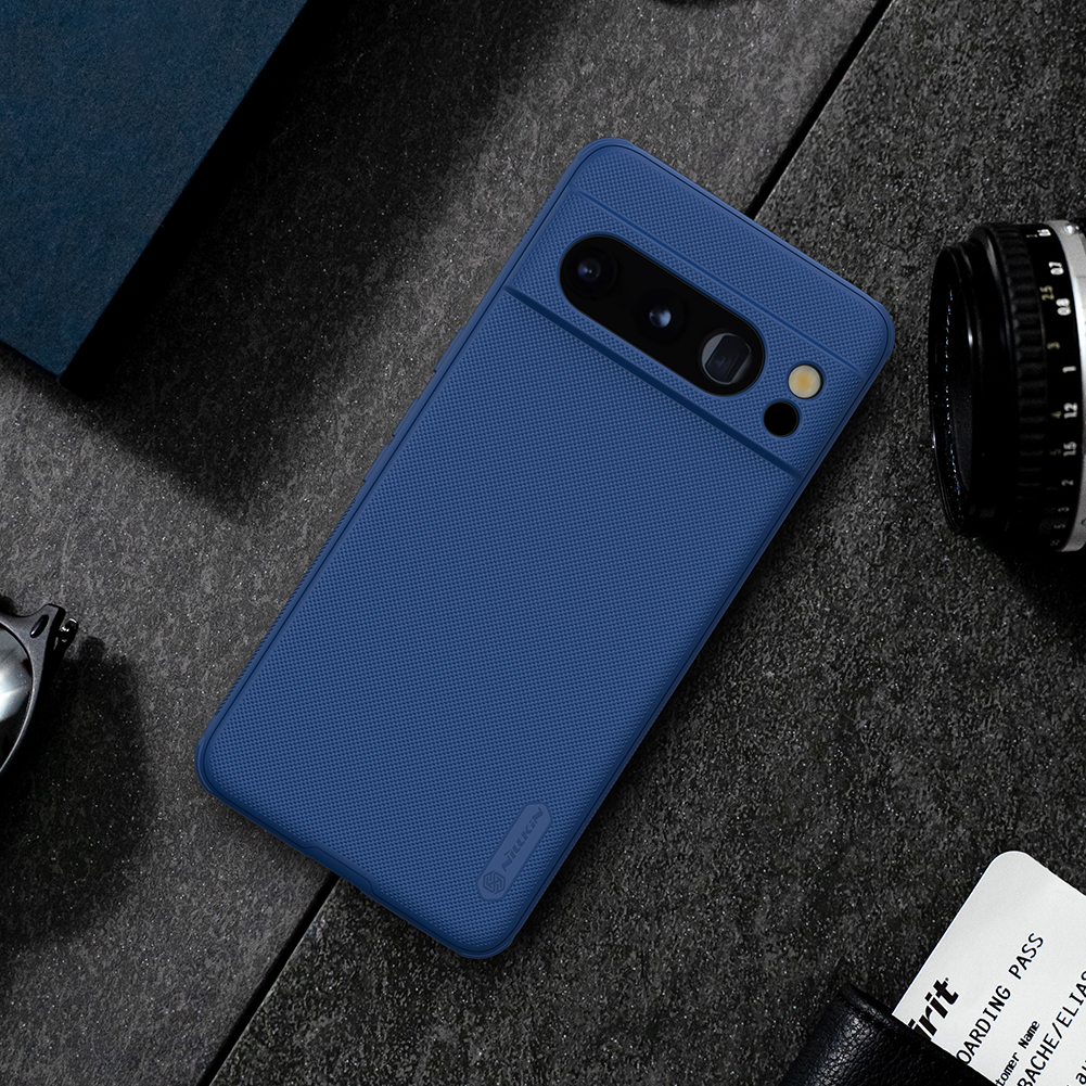 Защитный чехол синего цвета от Nillkin серии Super Frosted Shield Pro для смартфона Google Pixel 8 Pro с усиленными боковыми рамками по четырем углам, изготавливается из экологичных материалов PC и TPU путем высокоточного литья под давление с высокой температурой.