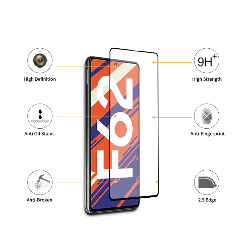 Защитное закаленное стекло 6D на дисплей для телефона Samsung M51, M52, M62 и F62 изготовлено из материалов высокого качества.
