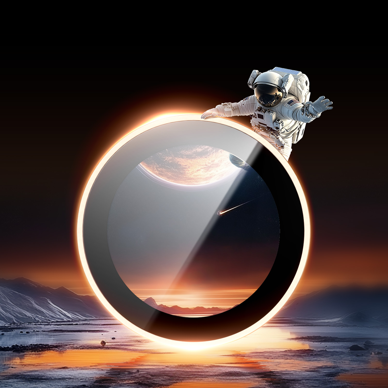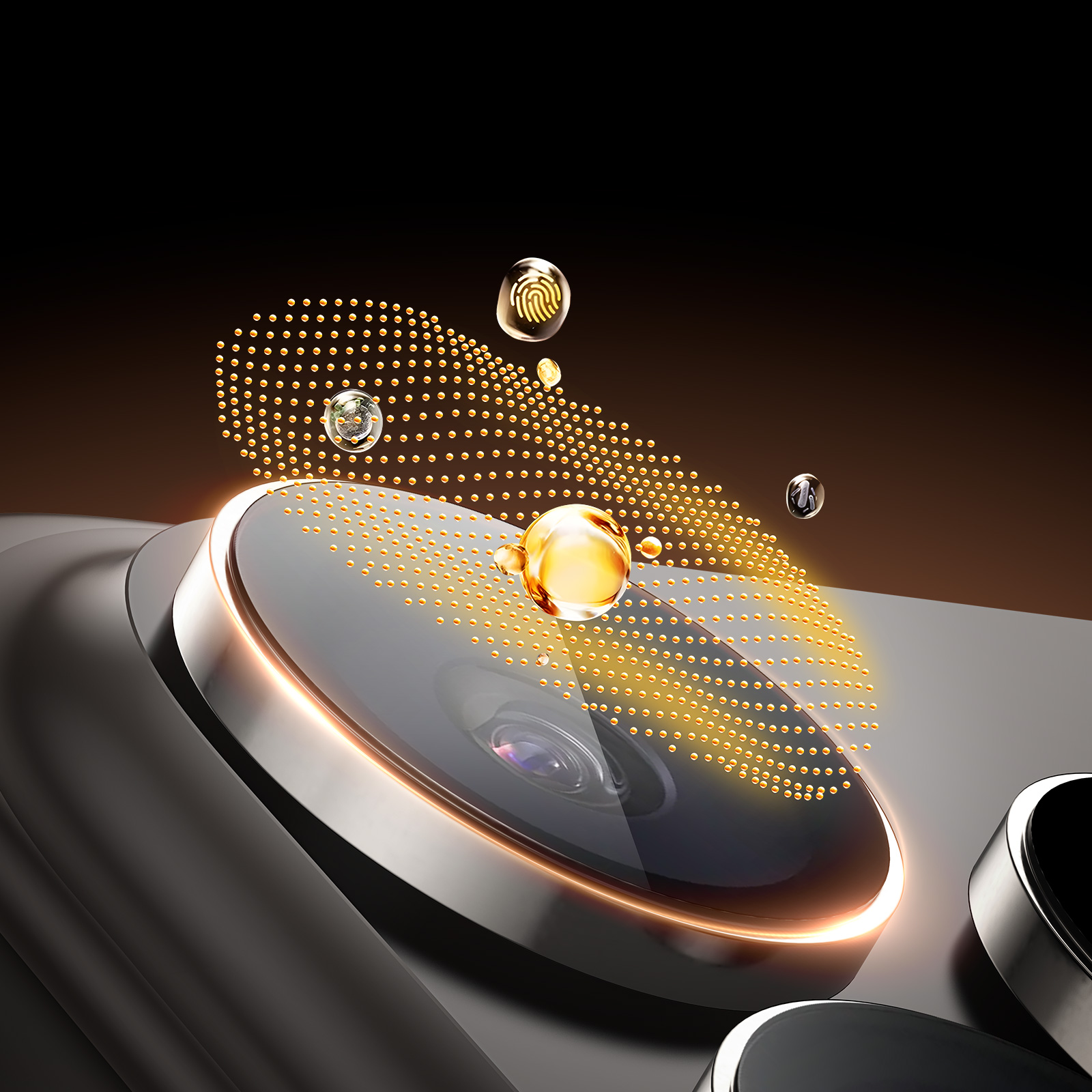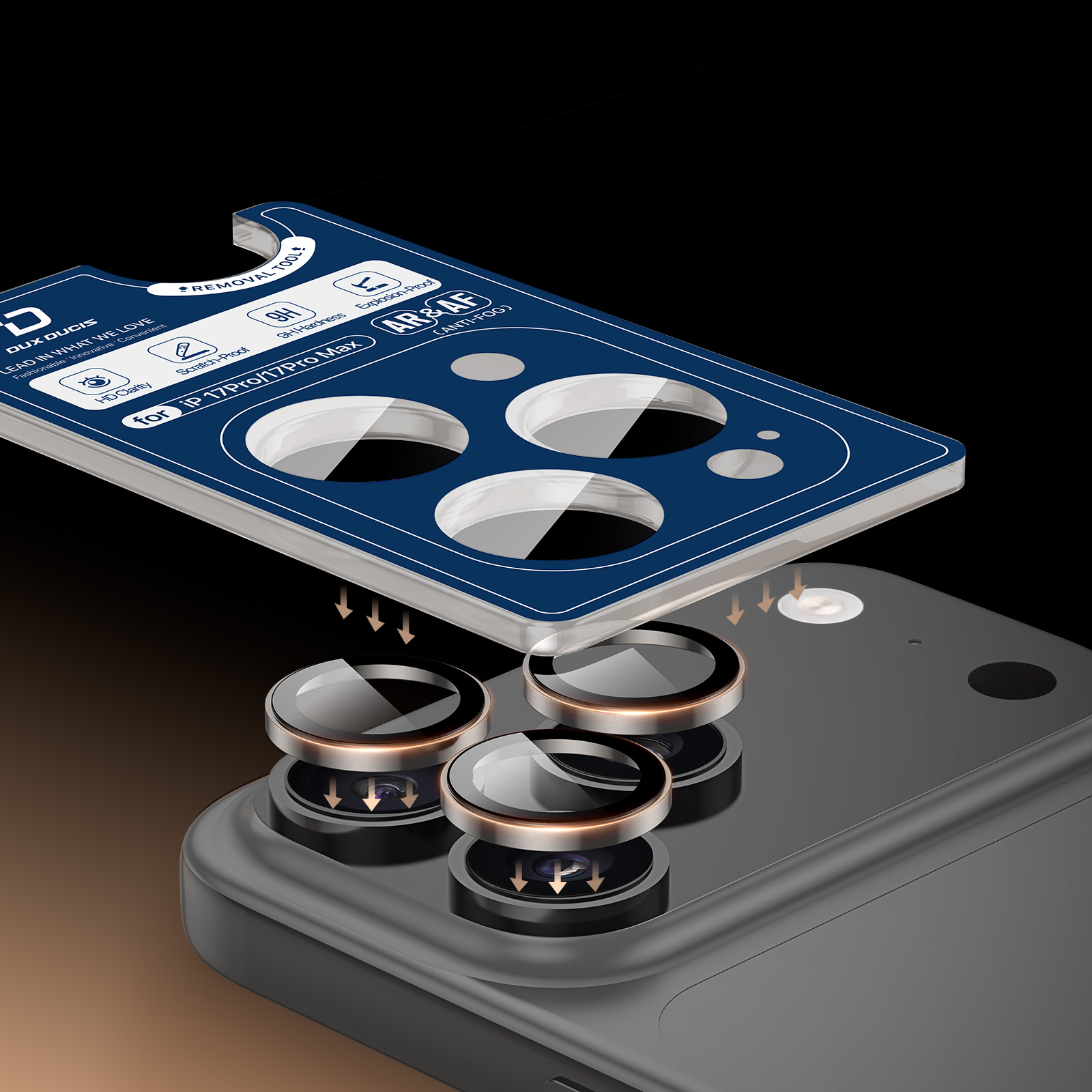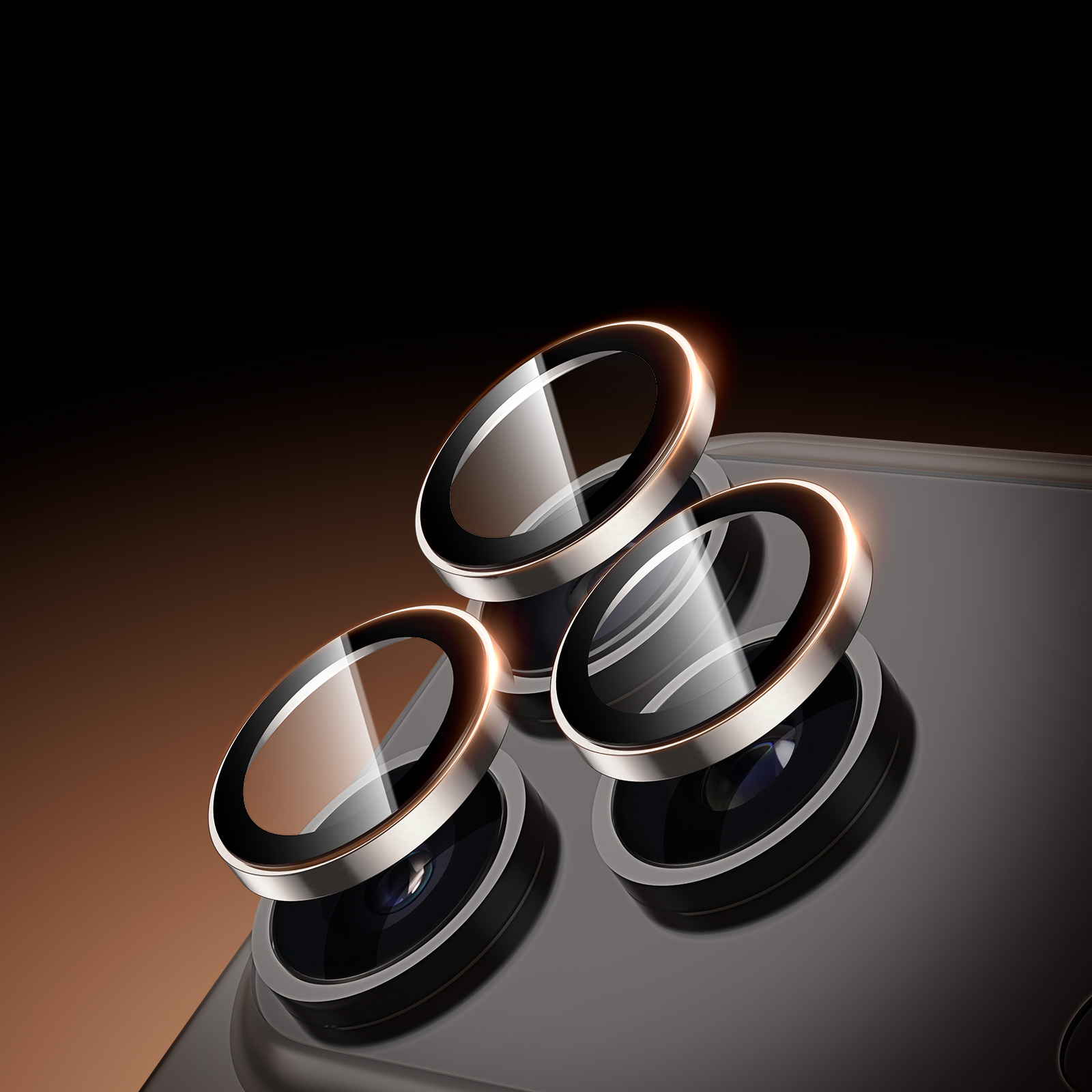 Закаленное стекло на линзы камеры для смартфона iPhone 17 Pro и 17 Pro Max от Dux Ducis серии HAWK Series Camera Lens Protector с алюминиевой рамкой оранжевого цвета (Cosmic Orange) по периметру.