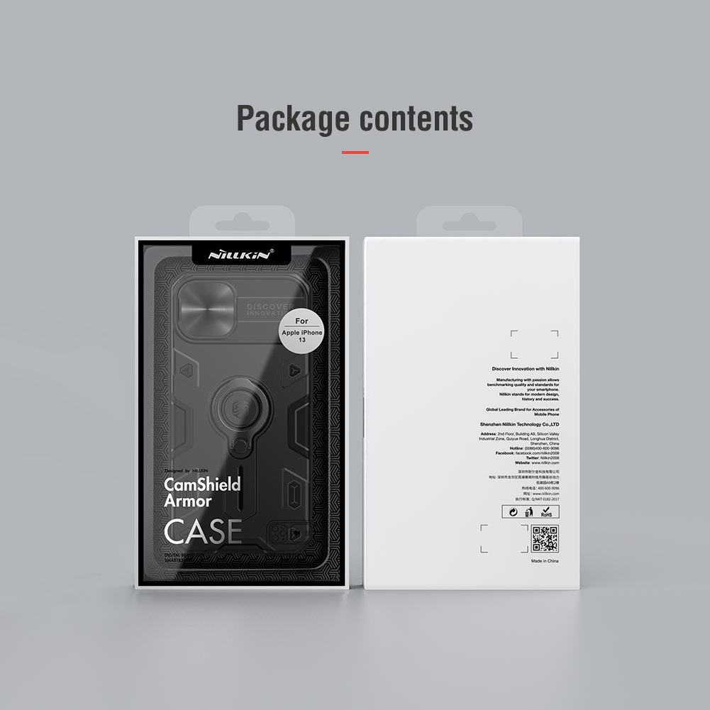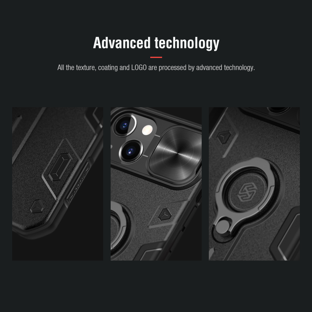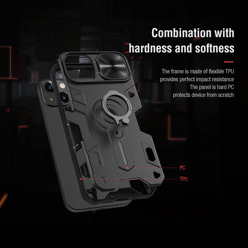 Противоударный чехол с кольцом и металлической защитной крышкой для задней камеры от Nillkin серии CamShield Armor Case для iPhone 13 создан для любителей активного отдыха.