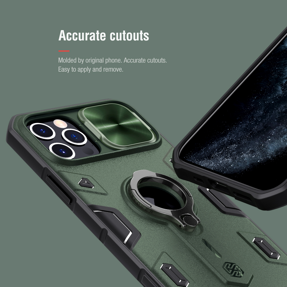 Противоударный чехол зеленого цвета с кольцом и металлической защитной крышкой для задней камеры (модель с отверстием под логотип) от Nillkin серии CamShield Armor Case для iPhone 12 и 12 pro создан для любителей активного отдыха.