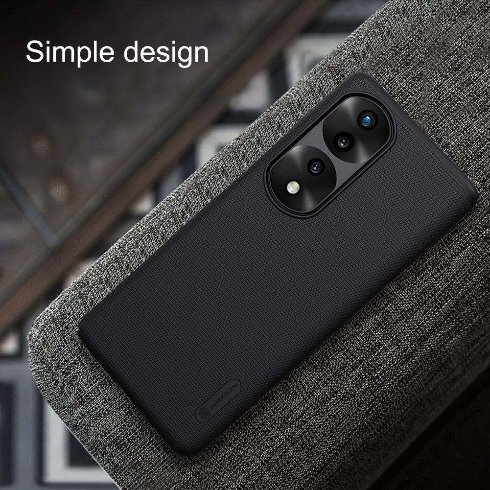 Тонкий чехол черного цвета от Nillkin серии Super Frosted Shield для смартфона Huawei Honor 70 Pro изготавливается из экологичных материалов путем высокоточного литья под давление с высокой температурой.